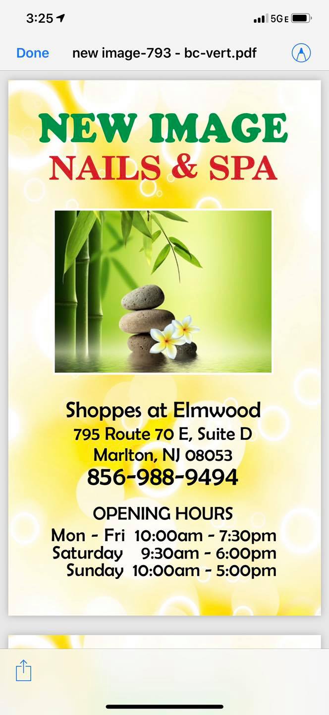 New Image Nails & Spa, located in Marlton, NJ 08053, at the Shoppes of Elmwood near Citizen bank, Mikado Restaurant, and Bernard's hair salon, offers a clean and welcoming environment for a relaxing experience. The salon is known for its dedication to delivering high-quality services at reasonable prices, utilizing top-of-the-line products for the finest results. Customers appreciate the professional and client-focused approach of the staff, who take their time to ensure each customer is happy with their service. One customer even drives an hour to the salon after seeing a family member's nails. The salon's cleanliness is often highlighted, with all tools sanitized and a wide range of quality nail polish, gel, and deep treatments available. A local resident confidently recommends New Image Nails & Spa as the best in town, praising the friendly and professional staff and the immaculate salon. The reviewer has tried several services, including gel nails and nail art, and has never been disappointed.