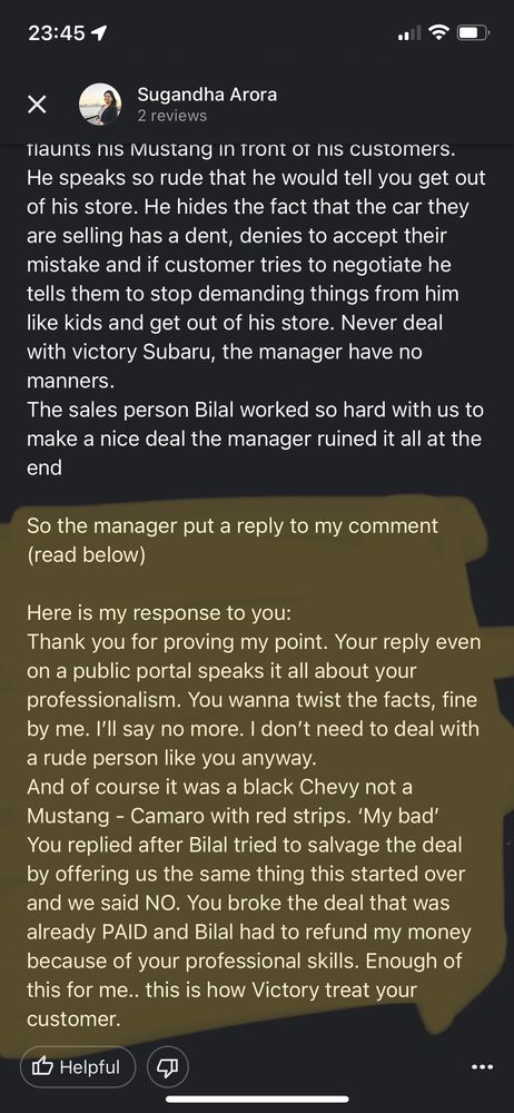 Bob at Subaru did a terrific job educating me on the different models of cars that I was looking at. Test drives were a breeze. I would highly recommend Bob and Victory Subaru!