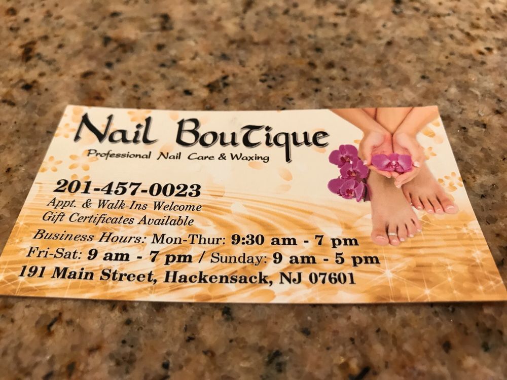 Located in Hackensack, New Jersey 07601, Nail Boutique offers ultimate pampering and beauty services to our clients. Customer satisfaction is our highest priority and we are committed to delivering that to you. Nail Boutique is a first-class Relaxation and Beauty Nails Spa (Professional salon in nail care and waxing services) that promotes comfort, beauty, well-being, and health to our customers. We are committed to providing you the latest advances in beauty care. We use ONLY the most trusted brands in the beauty industry. Our world-class products, services, and top technologies will make you feel great and make you look your best. Come visit us today!
