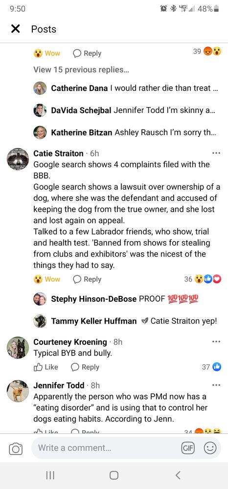 the worst. we gave a deposit. never saw a puppy. kept pushing our meet date out. do not get a puppy from her. we had a beautiful dog from her years . she has changed. worst ever. cried many tears. way too much stress.