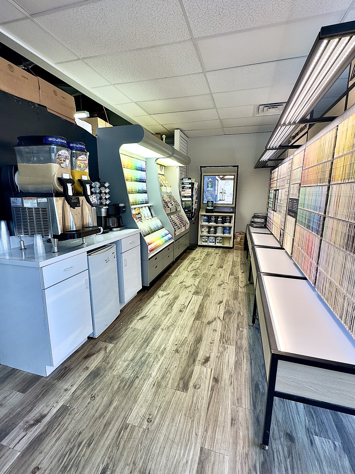 Well stocked, great service. They carry Ben Moore, PPG, Statewide and other paints. Good selection of sundries too. Free iced coffee is a great bonus!