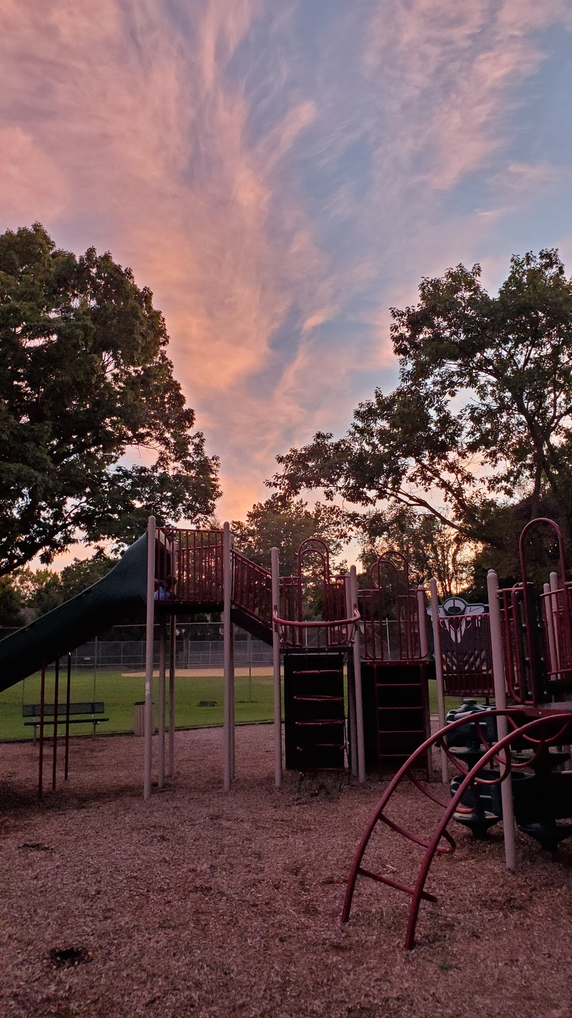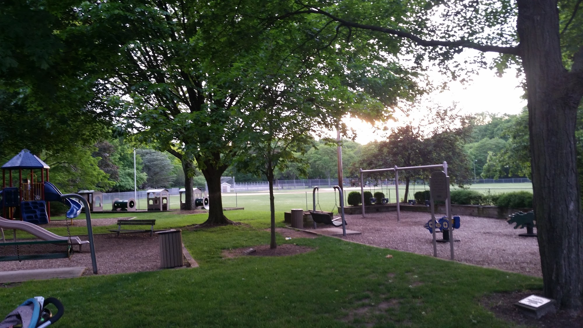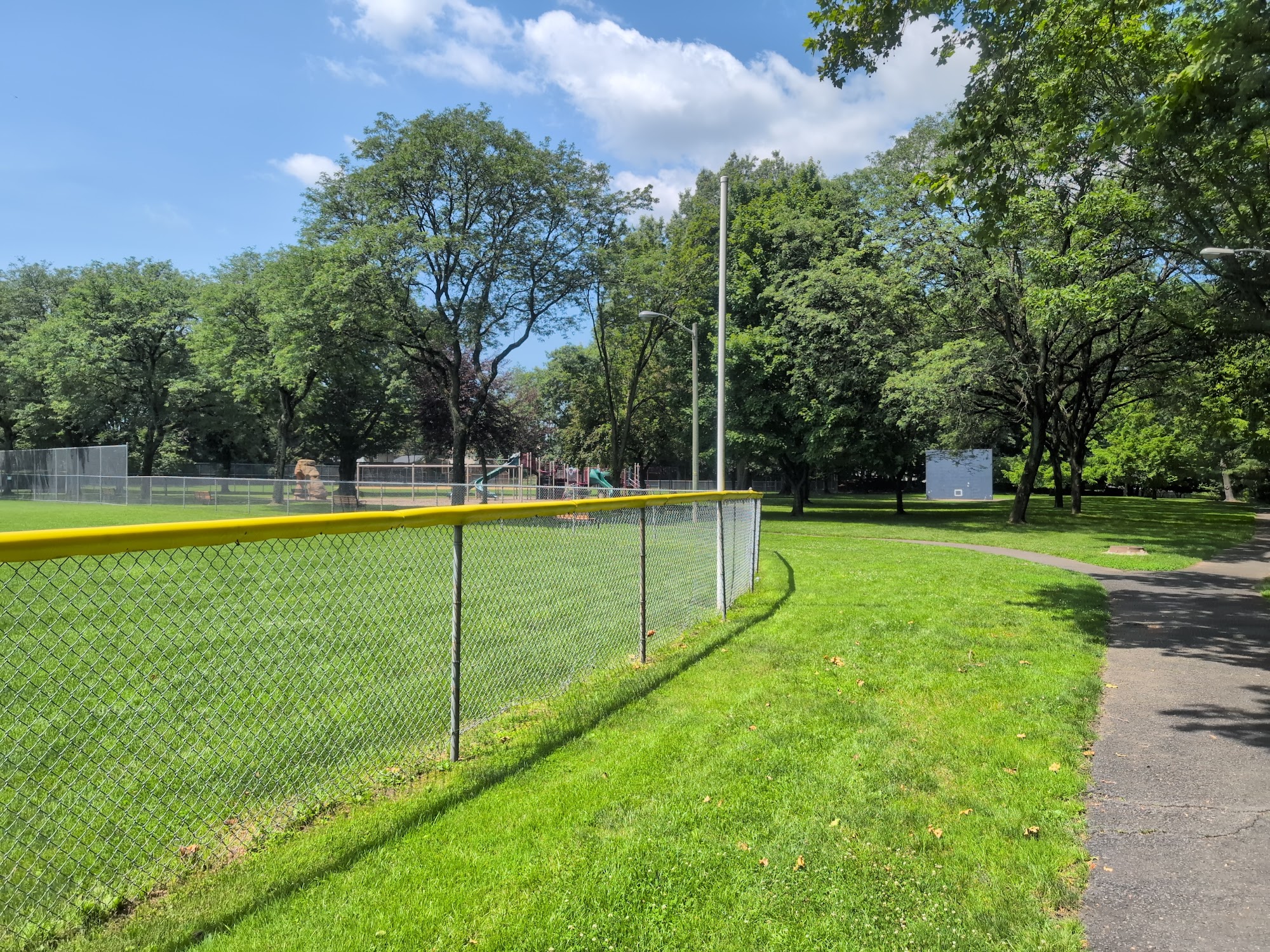 Paved walking path, basketball court outdoor hockey rink, playground, baseball field, picnic tables.