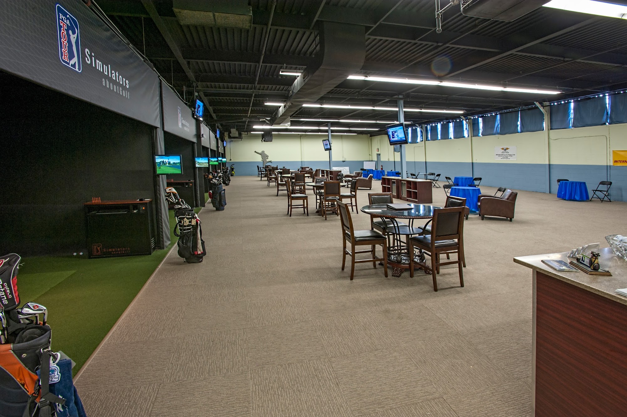 Players Club Virtual Golf offers a nice place with nice courses. Customers bring their own drinks and foods. Staff is warm welcomed and helpful, courteous, knowledgeable, and cool. The facility is great and reasonably priced, suitable for first timers or pros. It provides a fun atmosphere for reps in on rainy days with BYOB, sports on the TV's, solid music, and a nice hangout with friends. Plenty of bays, many courses, and $50 per hour, though a full 18 holes can feel pricy.