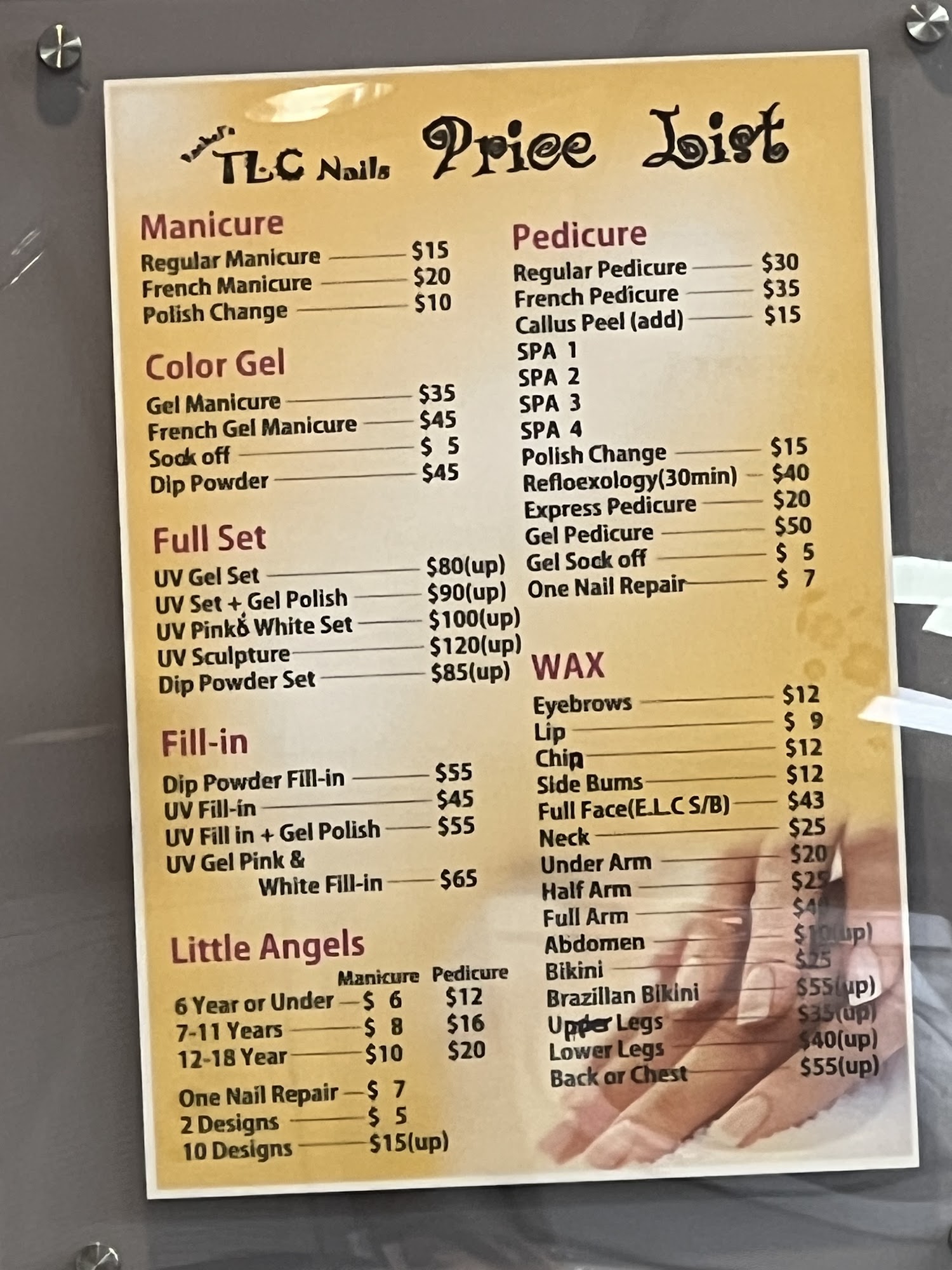 First time at TLC I had a gel fill in manicure & pedicure. I was very impressed with the salon, very clean & great service.Thank you Rachel for a great manicure I definitely will return.