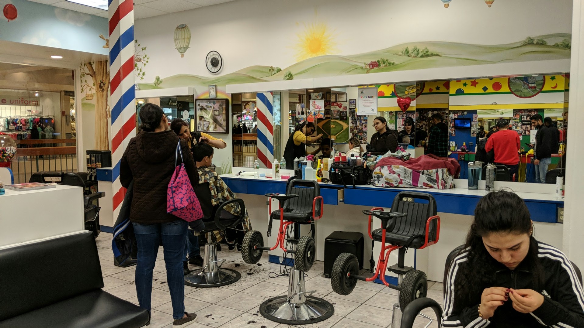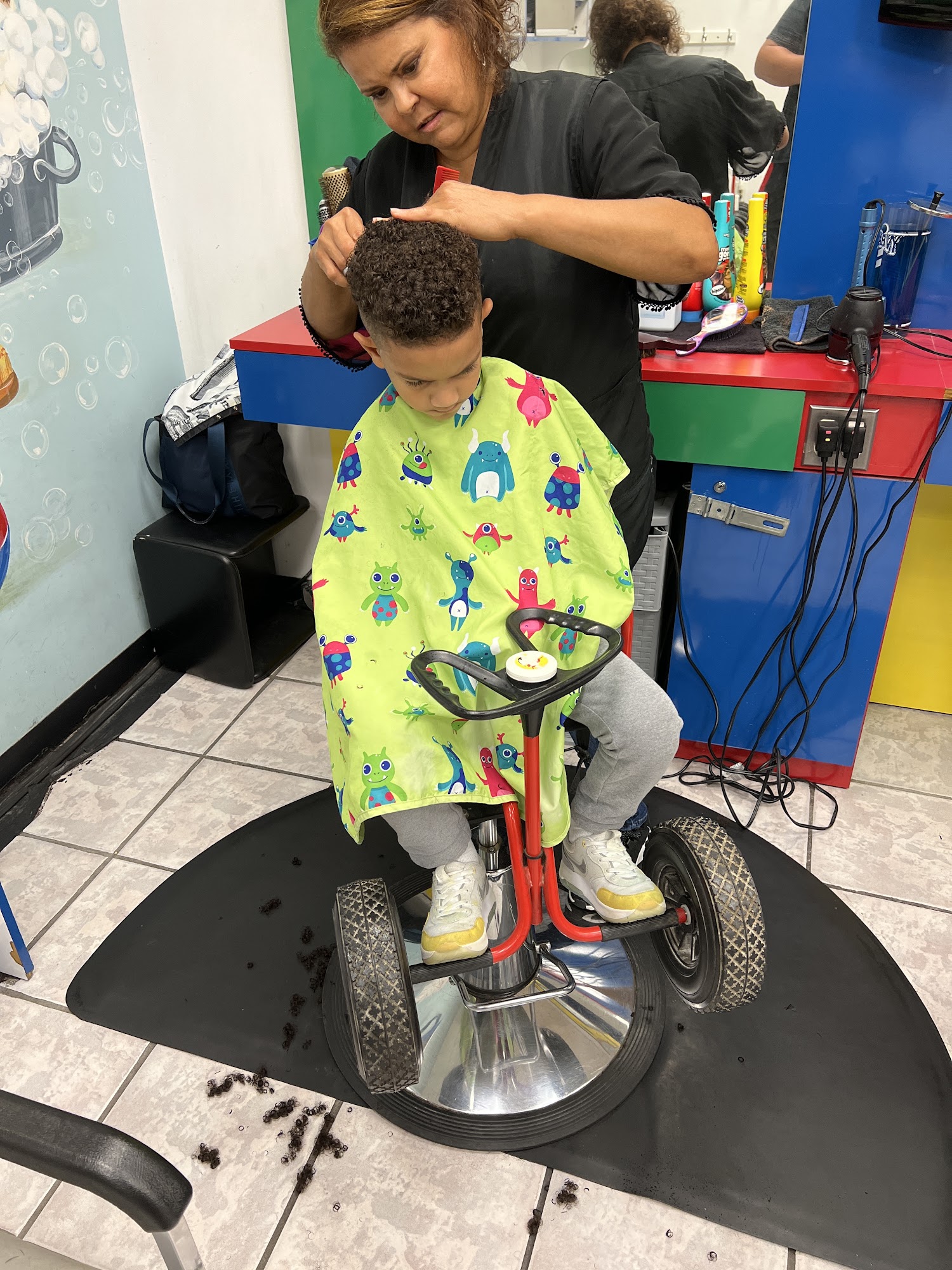 Kidz Kuts is a friendly place that specializes in kids' haircuts. The salon has special seats with steering wheels for children and offers a keepsake card with a clipping of the child's hair for their first cut. Stylists are patient and understanding, especially with children who have autism or sensory issues. Parents appreciate the stylists' willingness to listen to their requests and give children time to adjust to their new haircut. The staff, including Xiomara and Mona, are noted for their amazing skills, providing quick and efficient haircuts while ensuring that kids are comfortable. Mona handled a child's first haircut very well, engaging him with toys and an iPad, which helped make the process smooth. Xiomara went above and beyond to make a young boy feel comfortable with toys, bubbles, and her calm demeanor, turning his first haircut into a positive experience. Kidz Kuts also offers buzz cuts, making it a great choice for families looking for a welcoming atmosphere.