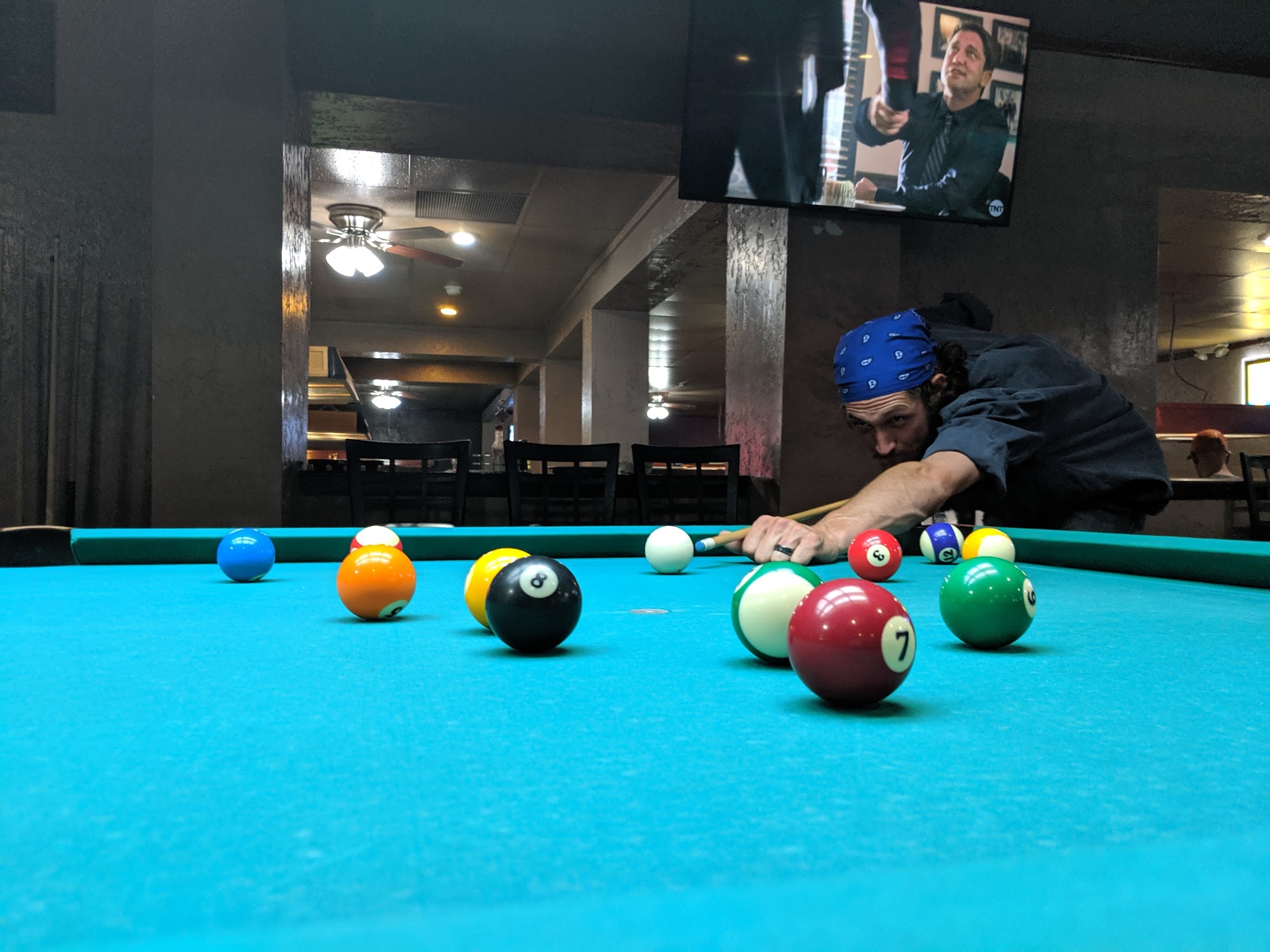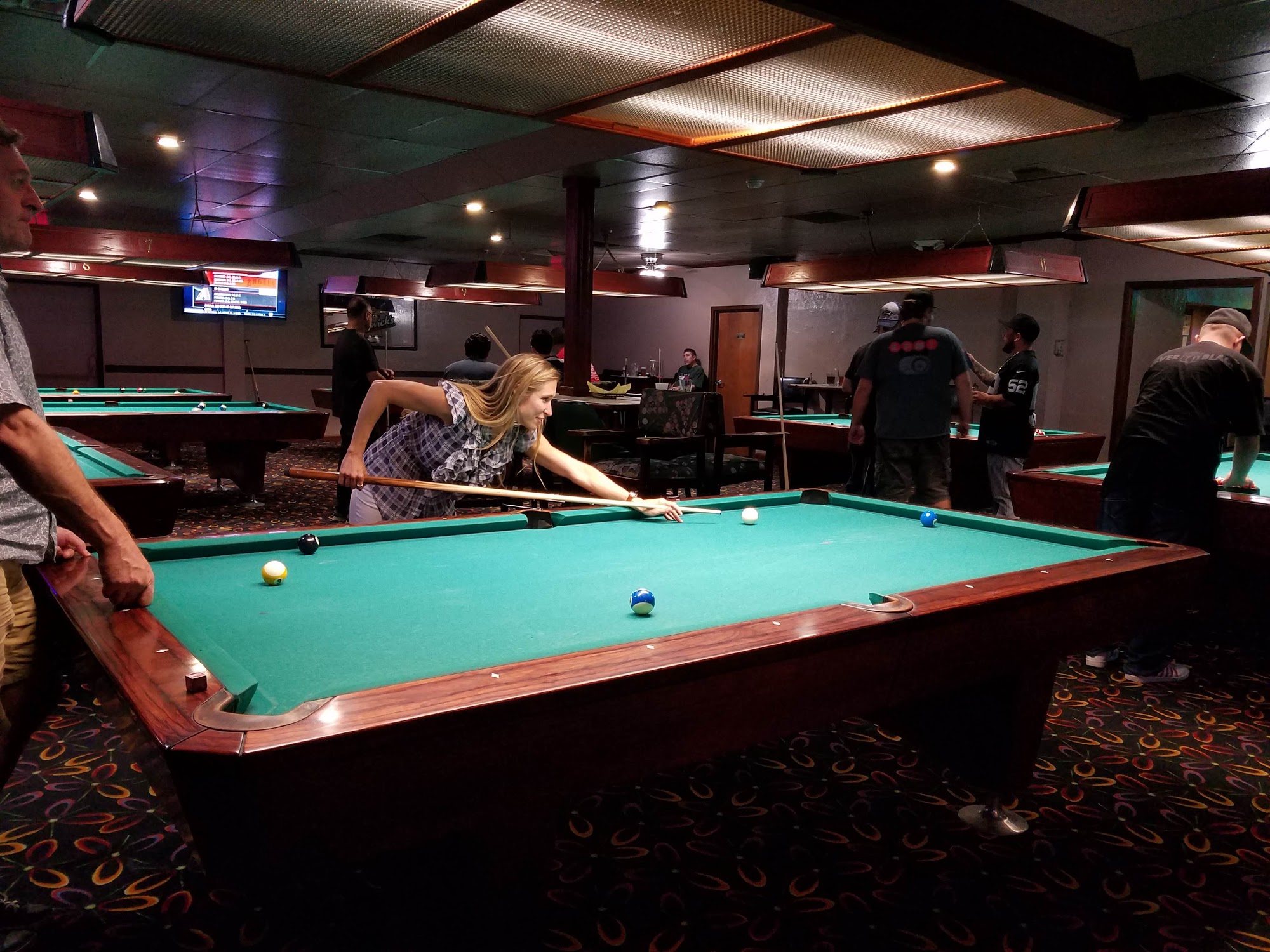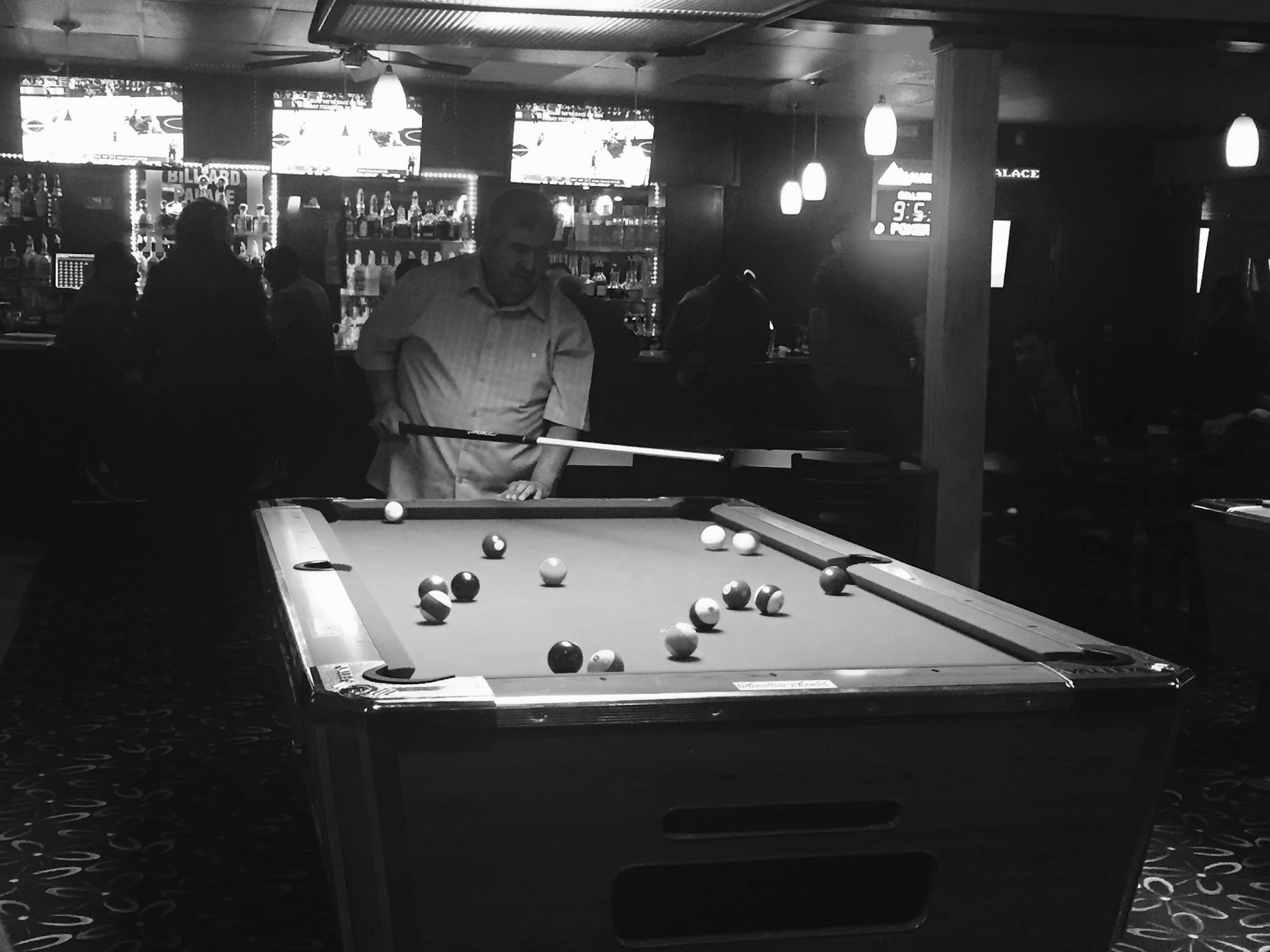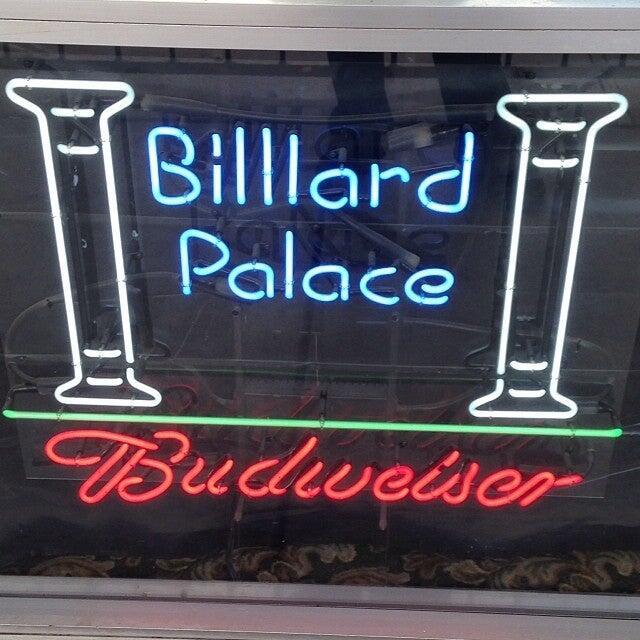 We love billiards palace, real 'authentic old school hall'. The food is really good. I love the chicken and beef nachos. Drinks are reasonably priced, but I've no experiences at the bar as far as the bartending. But the waitresses are very prompt and friendly. No fighting just great pool!