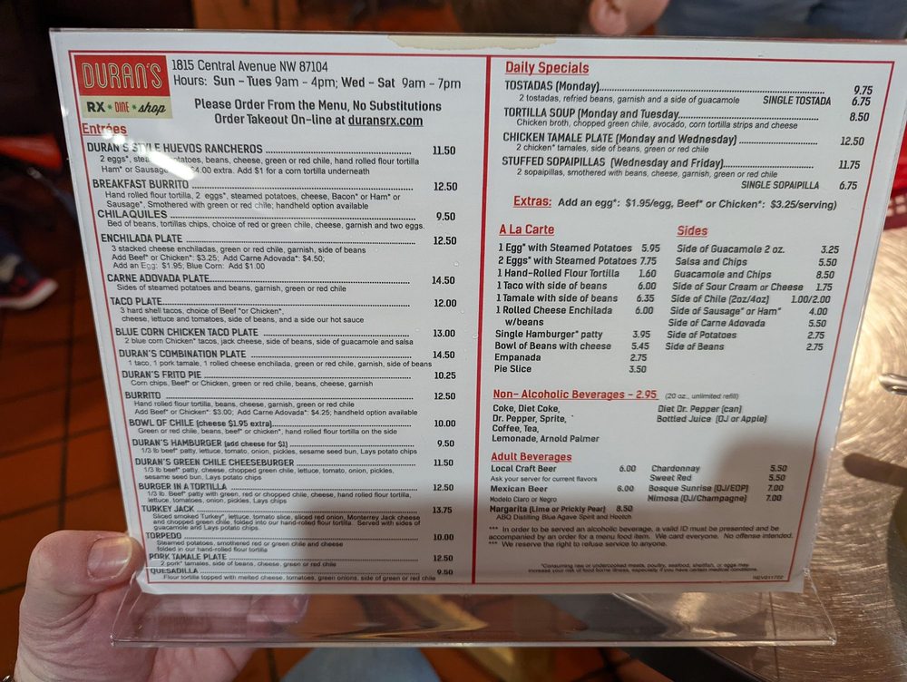 Good carne adovado and tortillas. Friendly service. ($10 for an ice cream size scoop of avocado was too expensive though.) The pharmacy has very good gifts. It's like a restaurant meets a gift shop meets a pharmacy. Unique place.
