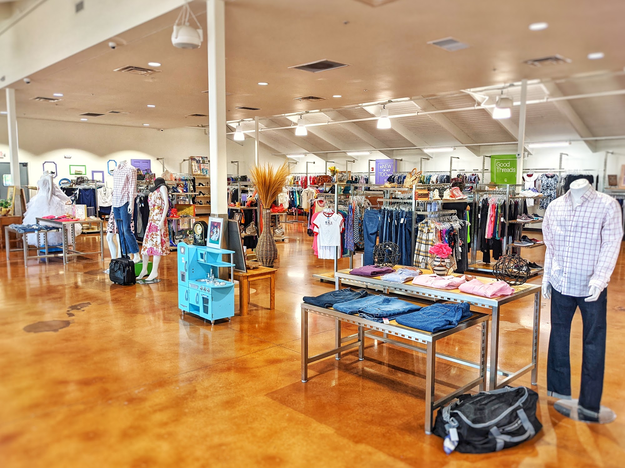 Clean well organized store with kids and adult clothes and acessories