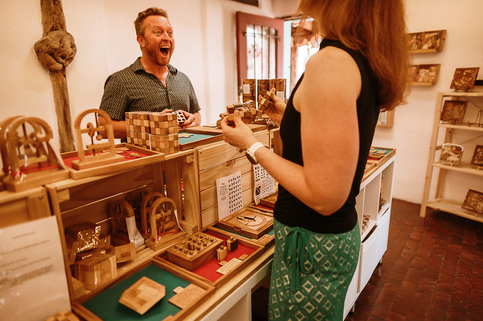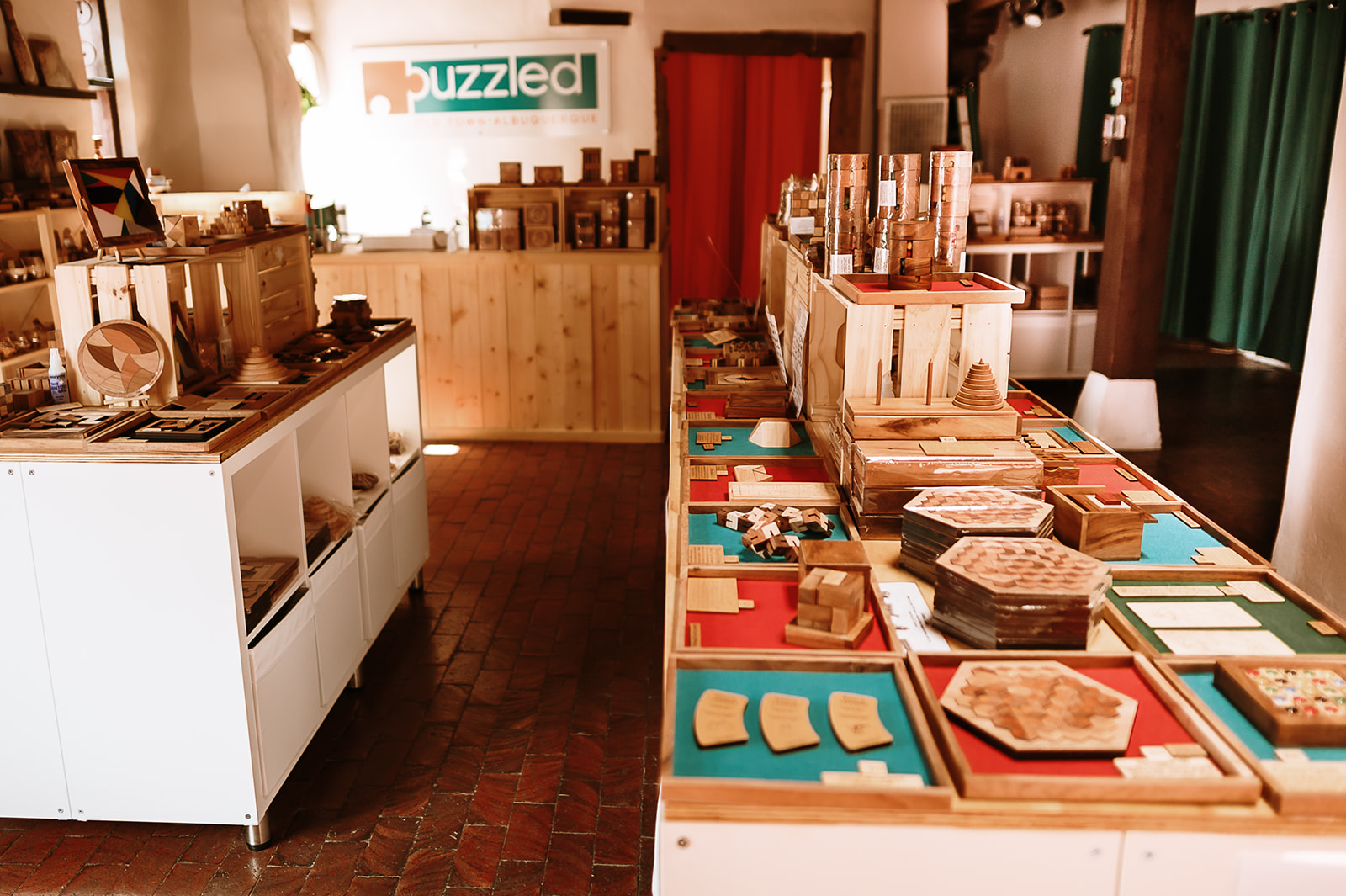 Nestled in the heart of Old Town Albuquerque's charming Poco a Poco patio, Puzzled enchants puzzle enthusiasts and fun seekers alike. Discover a haven where creativity thrives and connections blossom. Immerse yourself in New Mexico's largest collection of handcrafted wooden puzzles that ignite joy and curiosity. From brain teasers to jigsaw adventures, our treasure trove of games caters to every age and skill level. Experience personalized recommendations from our welcoming team, ready to guide you towards unique gifts, family bonding activities, or mindful screen-free escapes. Immerse yourself in hands-on shopping or explore our collection online 24/7.