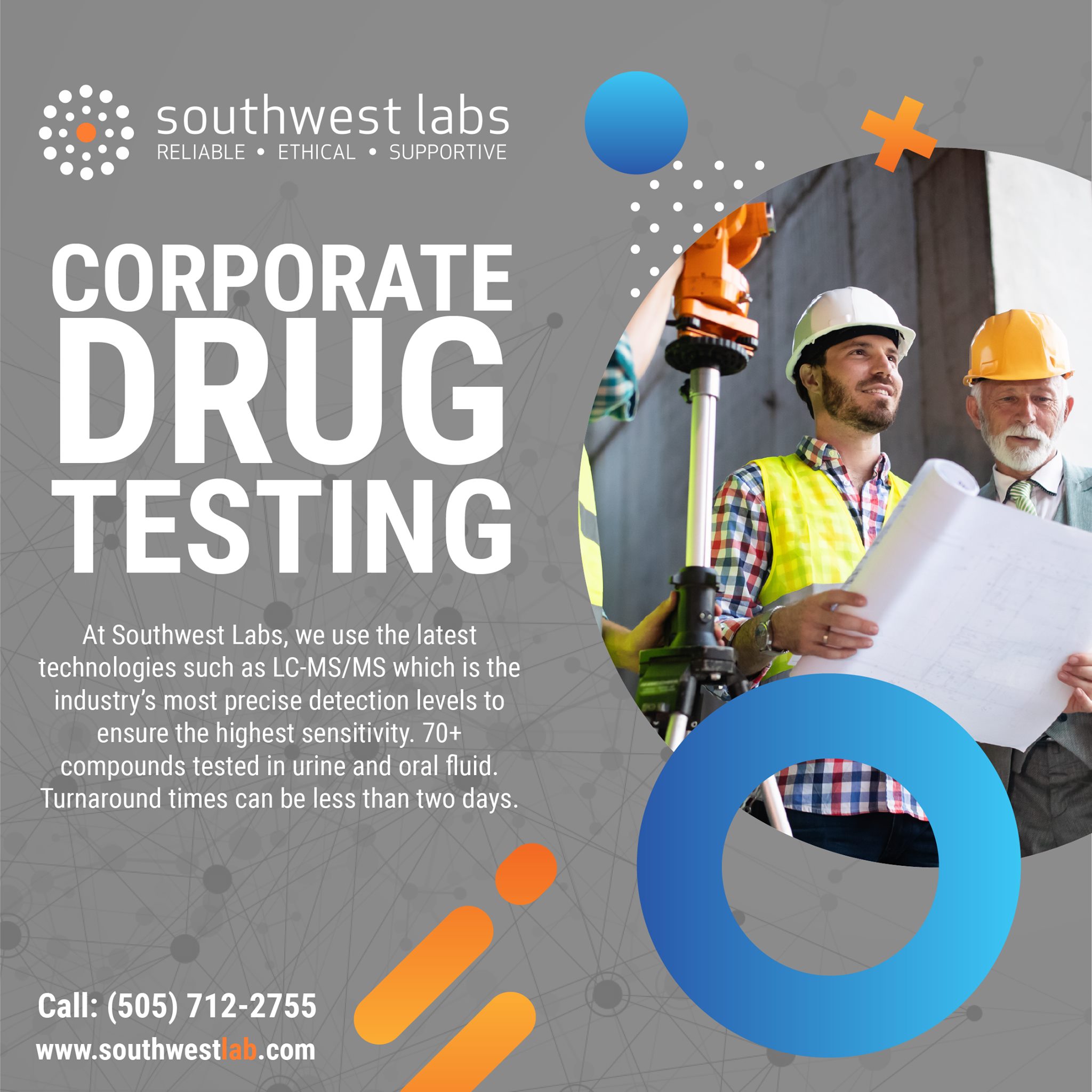 Southwest Labs is your locally owned and operated full service clinical medical laboratory. We specialize in Toxicology, Blood, COVID-19, and Men's & Women's Wellness testing.We are dedicated to serving the medical providers and patients of New Mexico. Southwest Labs was founded in 2015 and is devoted to community involvement, charitable contribution, and serving as a high-fidelity alternative to the local and national mega-labs that often fall short on customer service and provider satisfaction. As a physician, treatment center, or other provider, you can turn to SWL for accurate, timely, and reliable laboratory services.