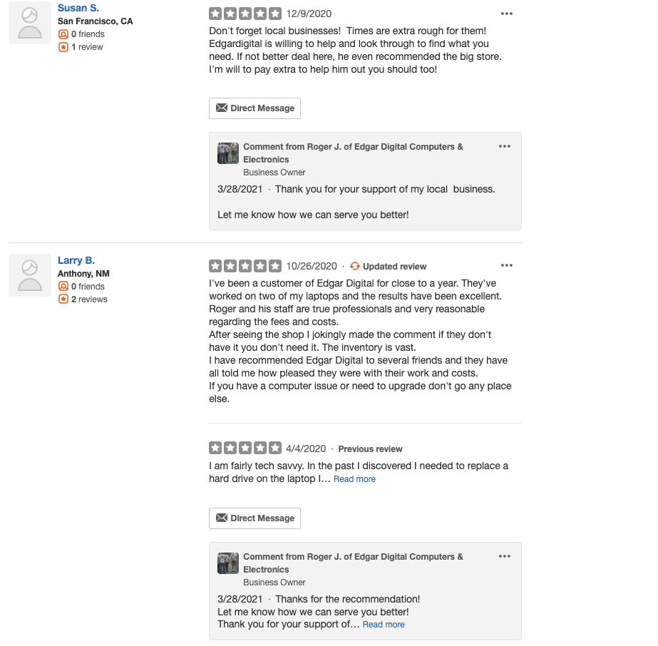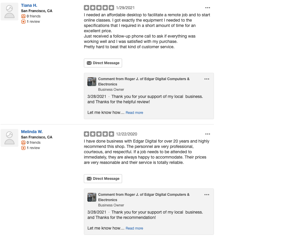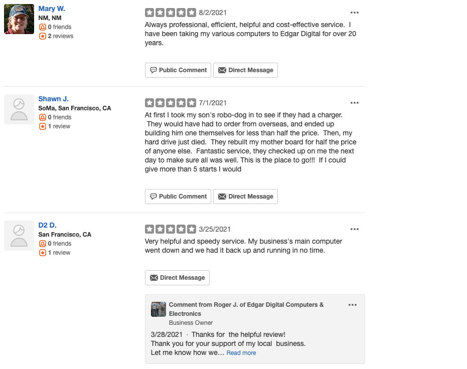 Edgar Digital-Electronics is a local small business that has gained a reputation for its excellent service and wide selection of hard-to-find digital devices and components. Customers praise the knowledgeable and accommodating staff, who are eager to help with their precise needs. Despite being a hidden gem, the store offers substantial savings compared to larger chain stores, particularly when it comes to aging laptops and accessories. Customers have found the staff to be graciously helpful both over the phone and in person, with one reviewer noting a "pleasure to shop at the Edgar local small business instead" of the impersonal big-box retailers. The business has also earned high marks for its reliability and fast service, with one customer running a DJ and karaoke business relying on them to keep their computer running like new before their next gig. Another reviewer even stated they would give 10 stars if possible, highlighting the exceptional service and efficiency provided by the team at Edgar Digital-Electronics.