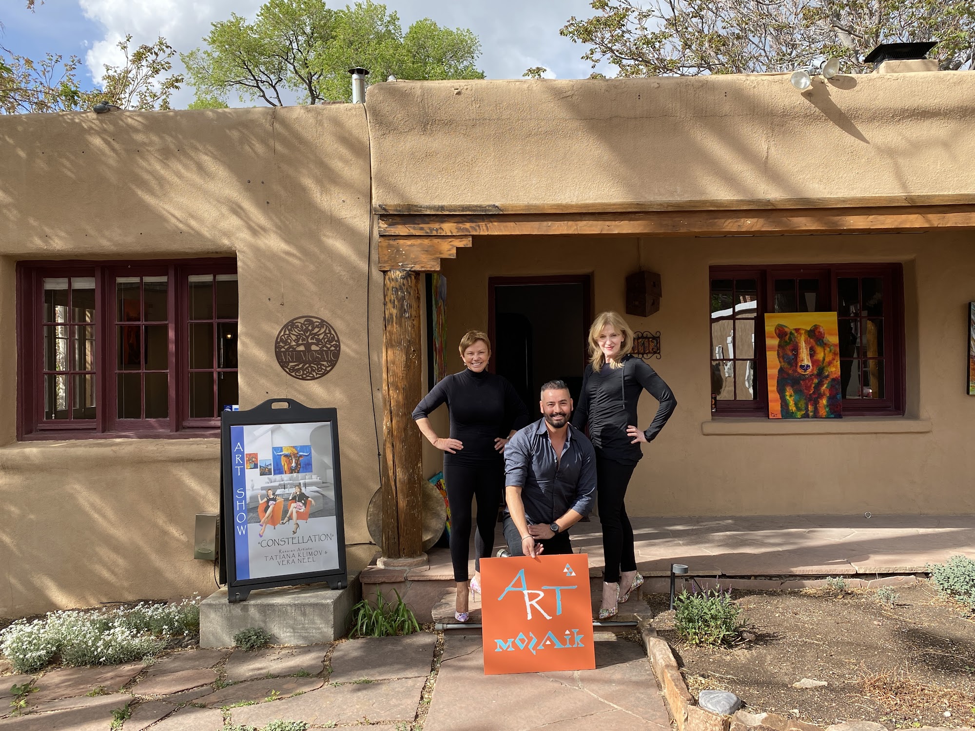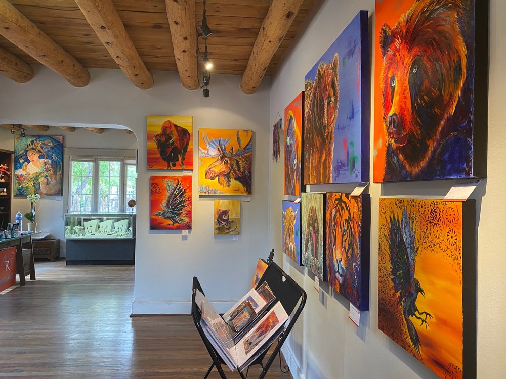 A vibrant, lively, and cheerful gallery where the atmosphere is filled with energy and color. Instead of being managed by sales staff, one of the two artists/owners is always present, warmly welcoming and engaging with visitors personally.