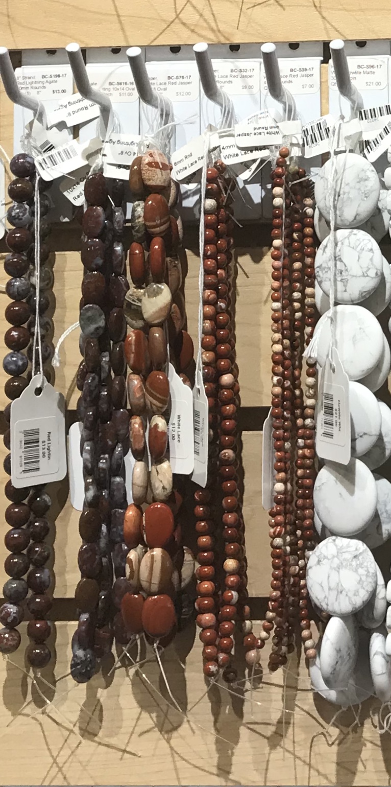 Gemstone quality beads for all of your artistic and creative needs. A large selection of beads, Agate, Jasper, Moonstone, Superseven, Selenite, 4 different mines of Natural Turquoise - Nevada #8, Sleeping Beauty, Kingman and Campitos. DELICA Seed Beads, in sizes 8/0, 11/0, about 500 colors to choose from! Miyuki Round Seed Beads in sized 11/0, 8/0 and 6/0. Matubo beads in size 6/0, 7/0, 8/0, & 11/0, Super Duos, Tilas in Full, Half, and Quarter sizes . Czech Glass Beads, African Trade Beads, Sea Glass and lots of findings. Stringing materials: Slon, plain and waxed, Silkon, leather, beading wire, Sinuw, power cord, Fireline, and wire for wire wrapping. Classes from Basic tool use to Intermediate Brick, Peyote and Herringbone Stitch types.