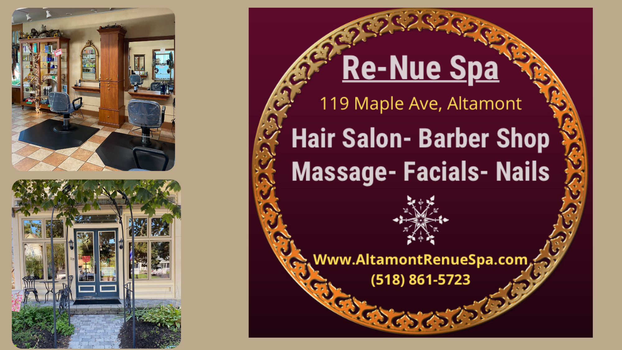 Re-Nue Spa blends the quaint village charm with complete professional services. We have a Barber shop and salon all in one. Barber, Massage, Facial & Nail Services are available for Men and Women. Our shop is part of the Historic walking tour in Altamont. It’s a quaint shop with a lot of character. We are an easy going group that is fun, caring and offers quality customer care.