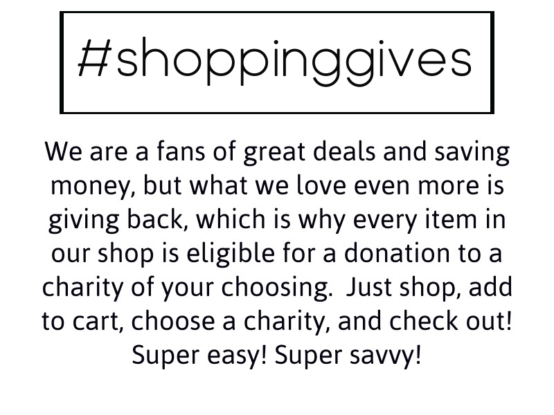We are fans of great deals and saving money, but what we love even more is giving back, which is why every item in our shop is eligible for a donation to a charity of your choosing. Just shop, add to cart, choose a charity, and check out! Super easy! Super savvy!