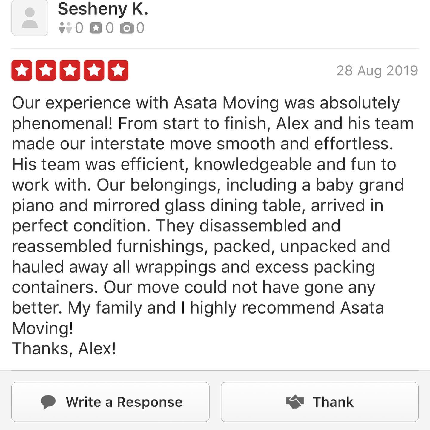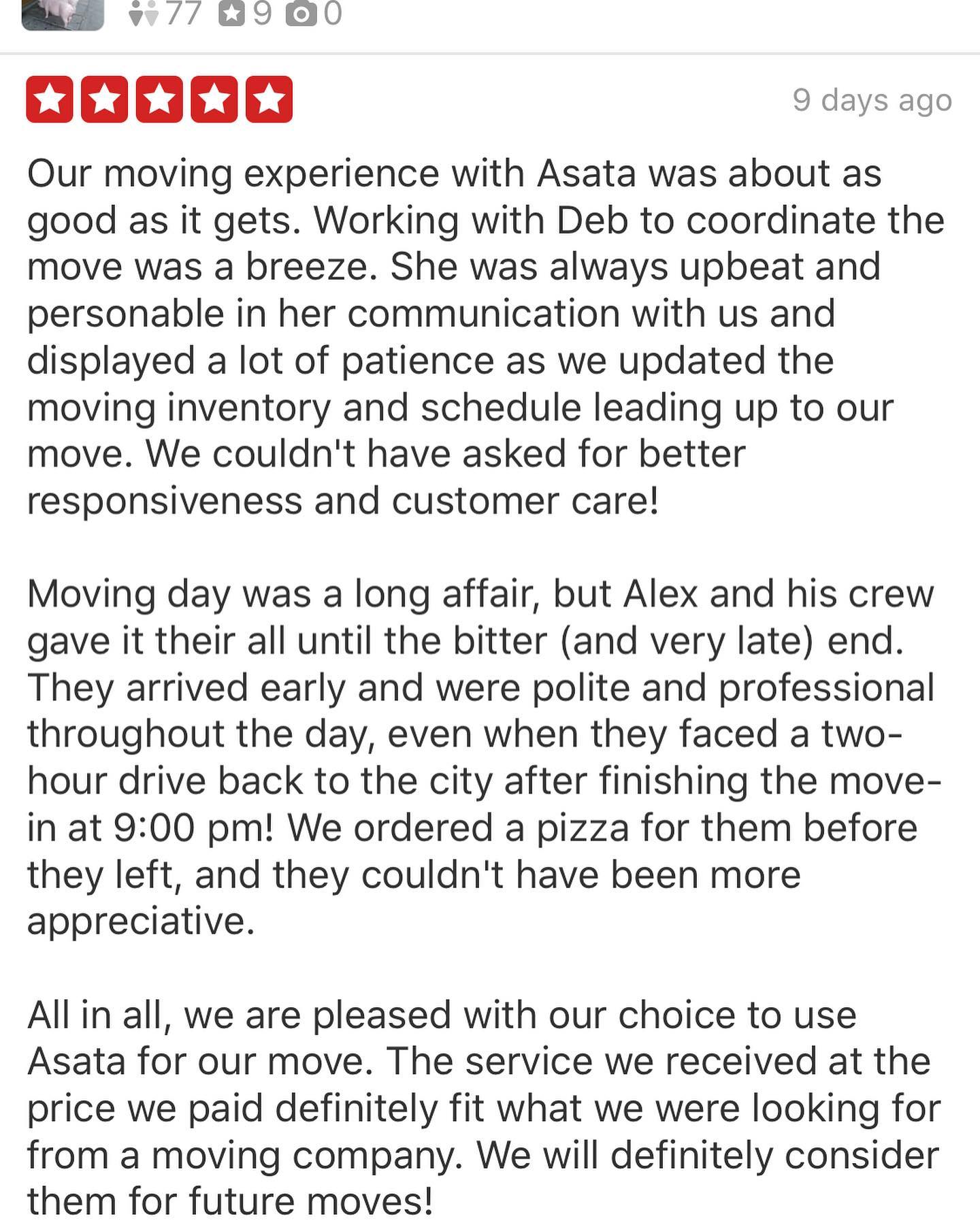 Hired Asata moving company for a 3 hour drive move. They were so nice and helpful and made my stressful day a complete breeze. Went above and beyond! Will recommend for the future. Thank you!