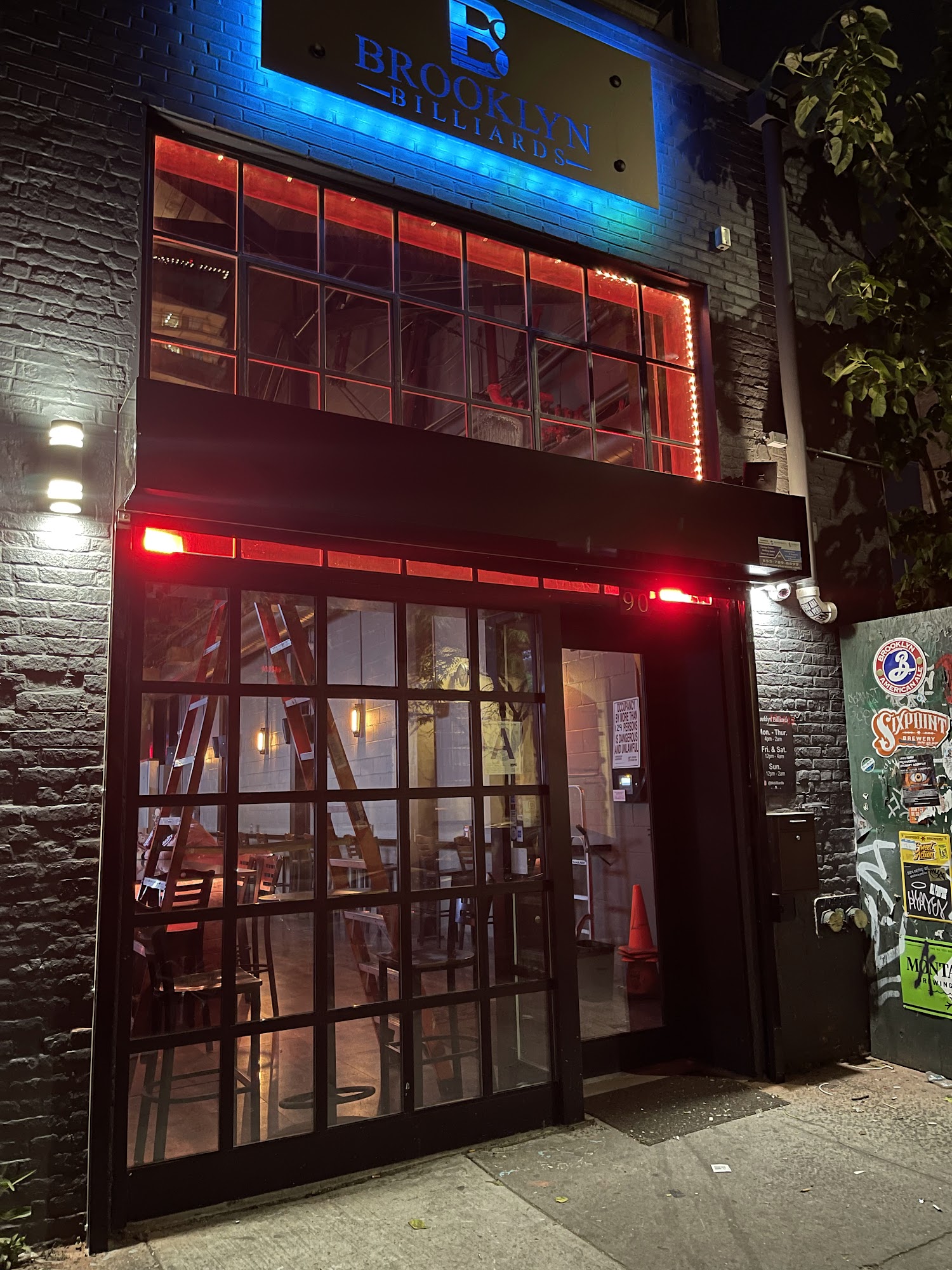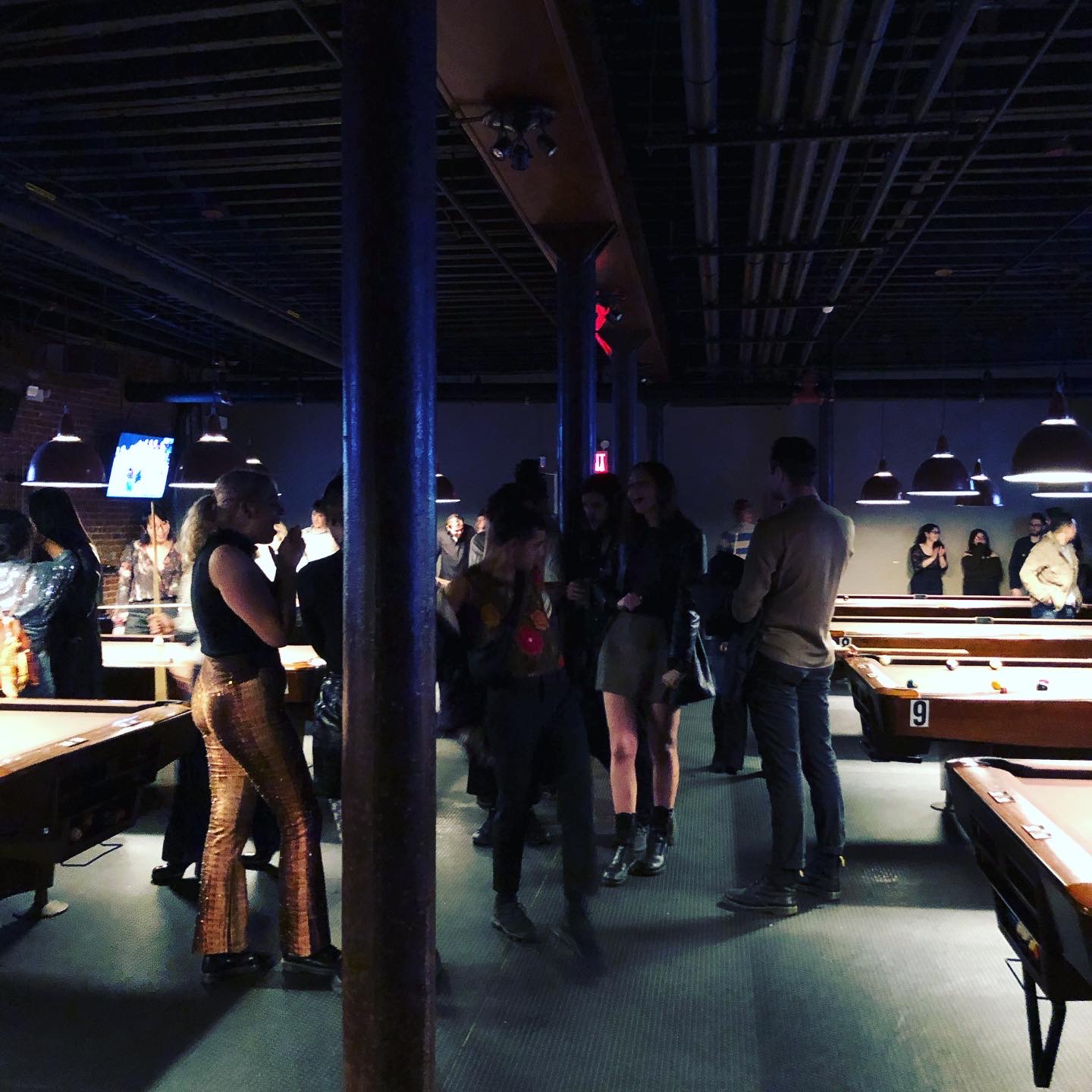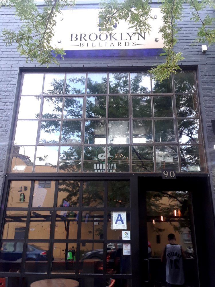 Brooklyn Billiards is a top notch hangout spot in the heart of Williamsburg. It is a great space with a cool modern bar area and an old school vibe pool hall. The place features a 55 foot bar, 13 flatscreen TVs, a kitchen, and 10 professional 9 foot billiard tables. It is a really cool spot for billiards with lots of tables; the wait is not too long and the pricing is very fair. People can play pool, have a drink, enjoy a cold beer, have a meal, and watch sports. The drinks and small bites are delicious and can be ordered straight to your pool table. The place is always a good vibe with reasonable music, strong drinks, attentive service, and fantastic energy. It is a chill place to hang, open late with food served late. Overall, it is a staple hangout spot for a night out with some games.
