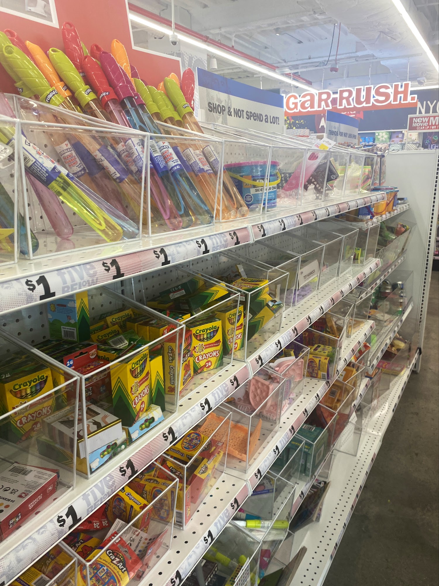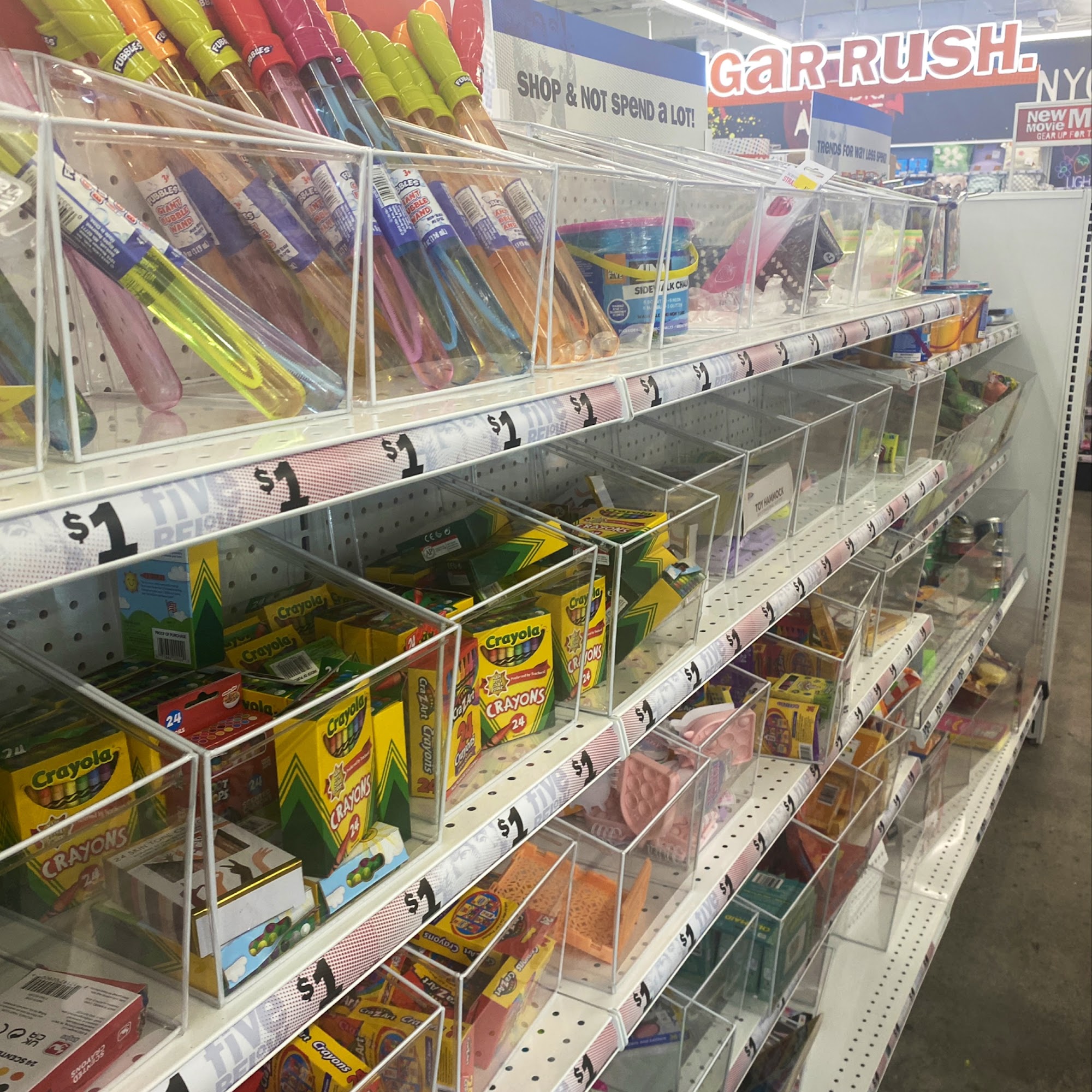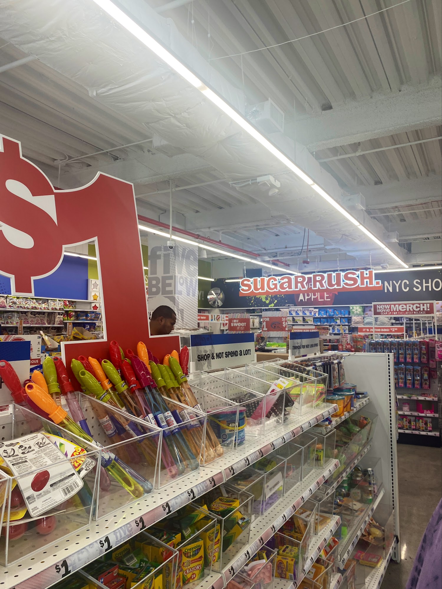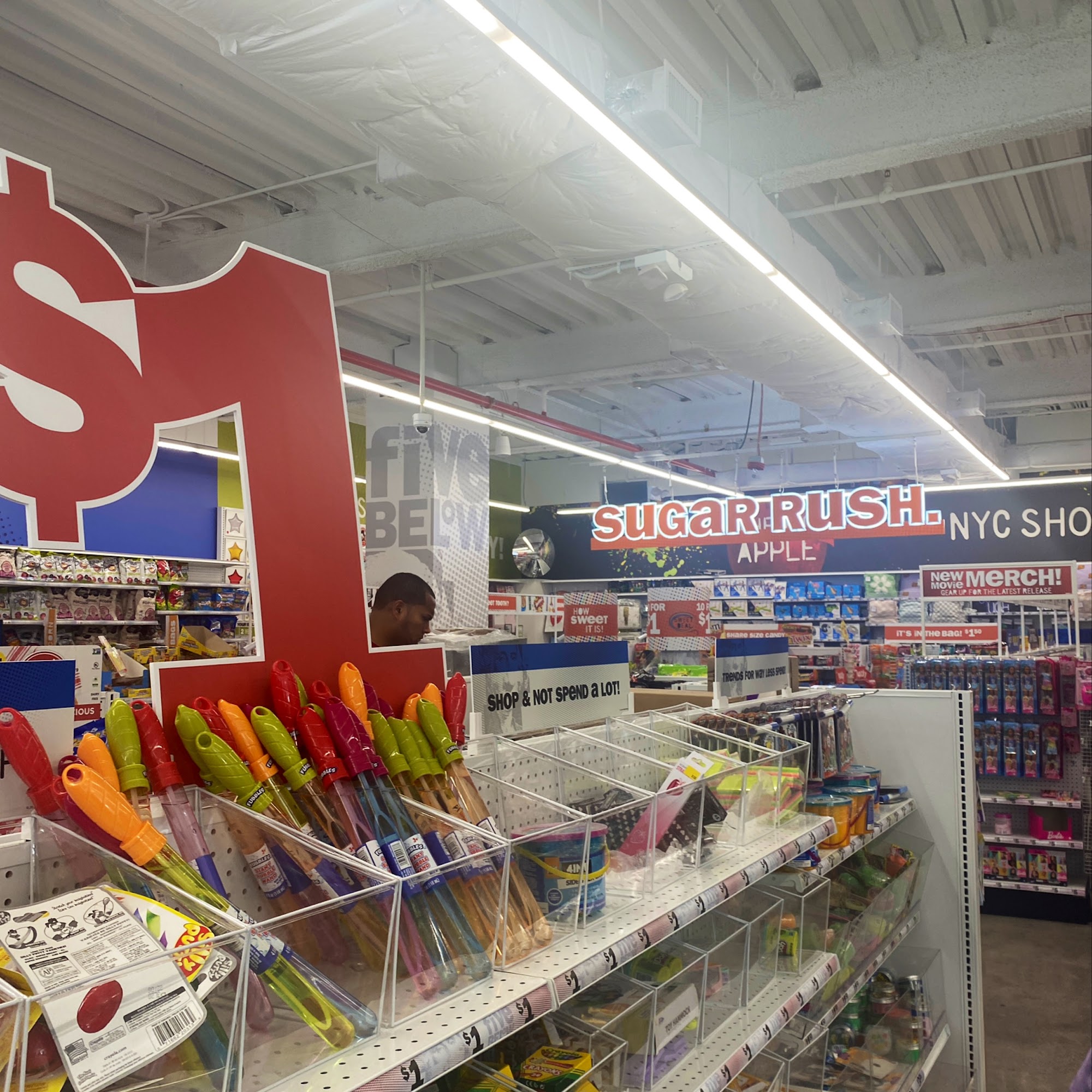 Five Below is clean and organized, with very stocked shelves offering things for school, dolls, books, sandals, bathing accessories, candy, and key chains, all at affordable prices. It is one of the few places to always find specific items like Charleston Chews. The staff provides good energy and is cool and nice. However, shelves can sometimes be a bit under stocked, and some previously available items are no longer there. The store sometimes has only one or two people working despite having many workers stocking.