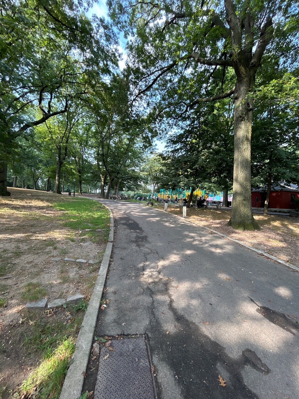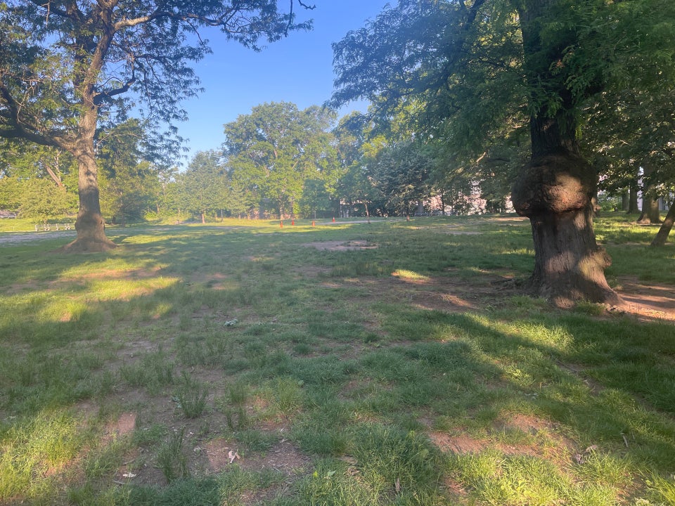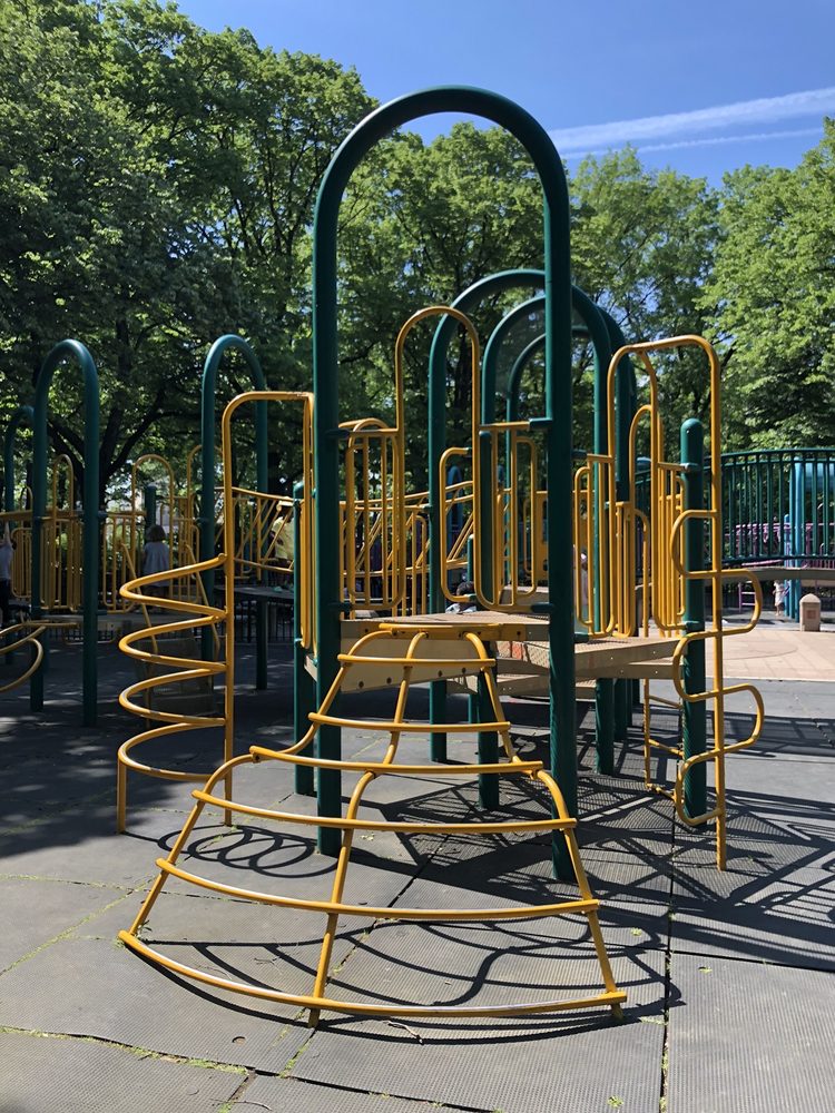 Mount Prospect Park is a nice big park with a great playground for kids. The playground is pretty good-sized and includes a splash pad with a water-spraying seal, tire swings, and regular swings. There are public restrooms available. The park offers a lovely spot for a family picnic, safe kid biking, or just to relax. The park is also very dog-friendly and sees a lot of cute dogs, though some reviews note a problem with dogs being off their leashes. The paths are bumpy and patched but are undergoing repaving for bicycle riding and rollerblading. The lawn and grass areas need some work and are partly dirt patches, which is attributed to great community use. While not particularly well-maintained apart from the playground, it remains a place where families have a lot of fun.