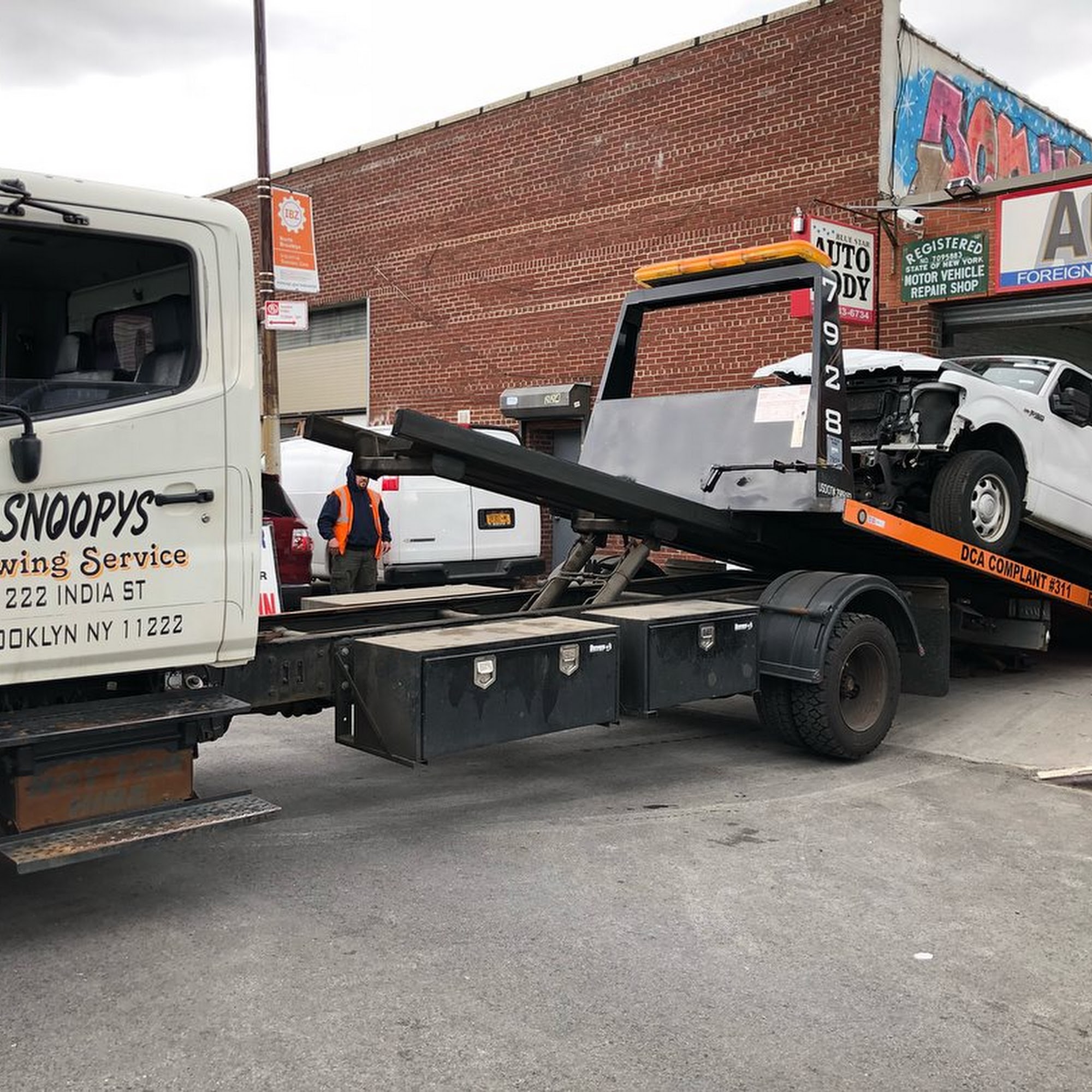 - Your Trusted Local Greenpoint, Brooklyn Towing Service! Roadside Assistance at Your Fingertips We understand that vehicle troubles can strike at the most inconvenient times. That's why Snoopy's Towing is here to provide fast and reliable roadside assistance. Jumpstart Services Is your car's battery giving you trouble? Our experts can jumpstart your vehicle, so you can get back on the road without delays. Mechanical Problems From mysterious engine noises to transmission hiccups, our skilled team can diagnose and repair a wide range of mechanical issues, ensuring your vehicle runs smoothly. Flat Tire Change Don't let a flat tire deflate your plans. We'll change your flat tire with ease, so you can continue your journey hassle-free.
