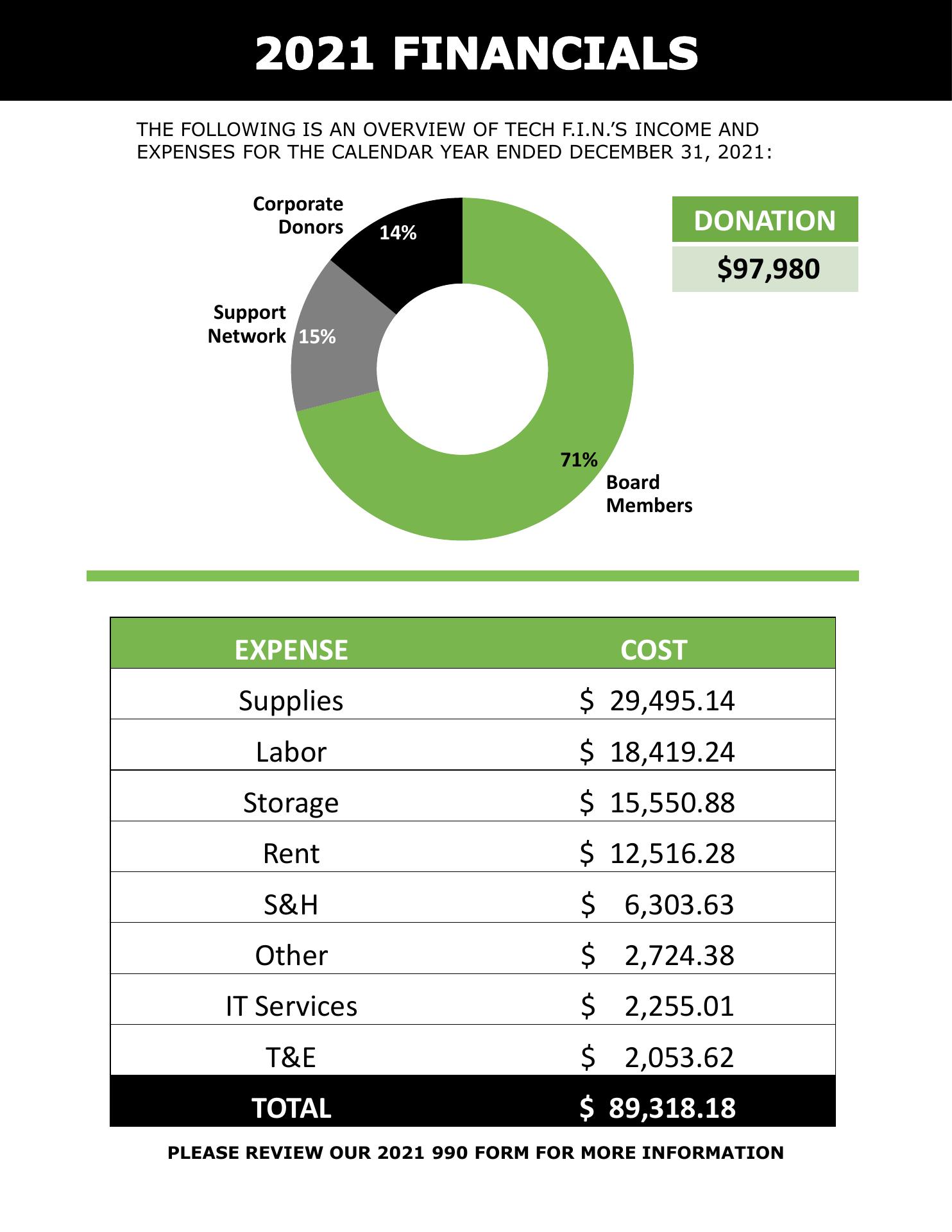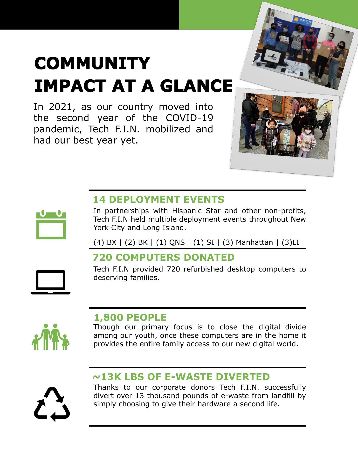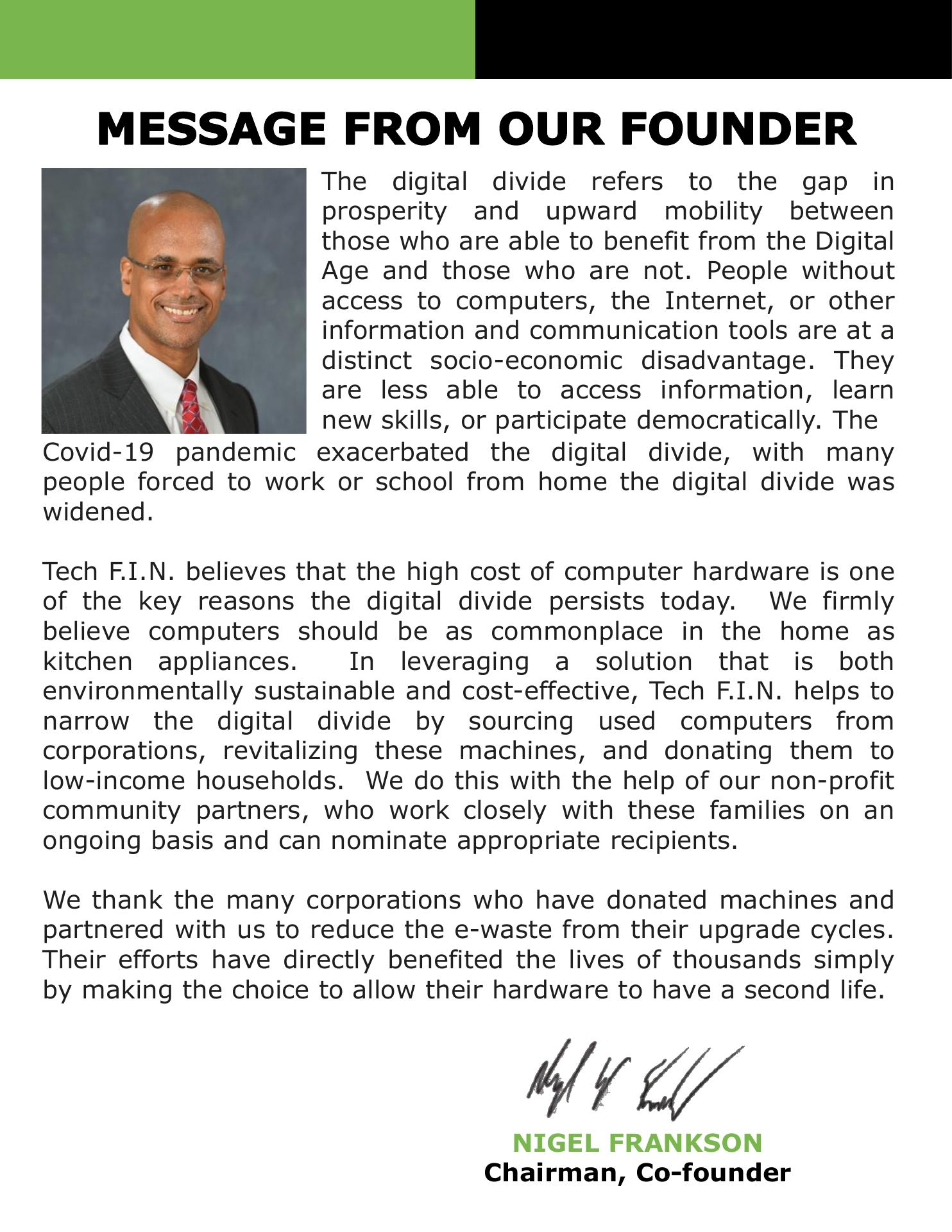 TechFIN sources computer hardware from corporations, in bulk, and revitalizes these machines for distribution to low income households, at no cost to them. We accept PC based laptops, desktops and monitors, from generous corporate donors. Please visit our website for more details.