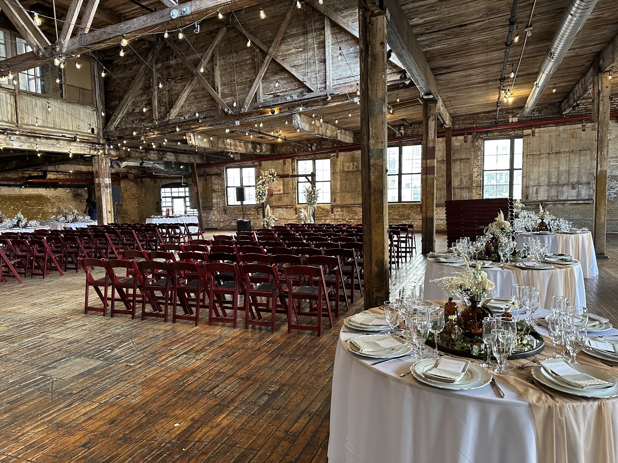 The Greenpoint Loft is a phenomenal wedding venue in Brooklyn. The space is very nice, big, and very open, with tons of space to party. It offers a unique blend of rustic charm and urban elegance, featuring exposed brick and wood. The venue has diverse spaces and different levels, from the main floor to the mezzanine and rooftop, providing a stunning backdrop. The atmosphere is awesome, warm, and perfect for genuine interaction and a great party. There is an abundance of natural light, and the sunset photographs are fantastic, with a nighttime view that is hard to beat. The staff provides exceptional cooperation and support, with professionalism and dedication to ensuring everything runs smoothly. It is a partner in creating memorable experiences and a perfect canvas for couples to make it their own.