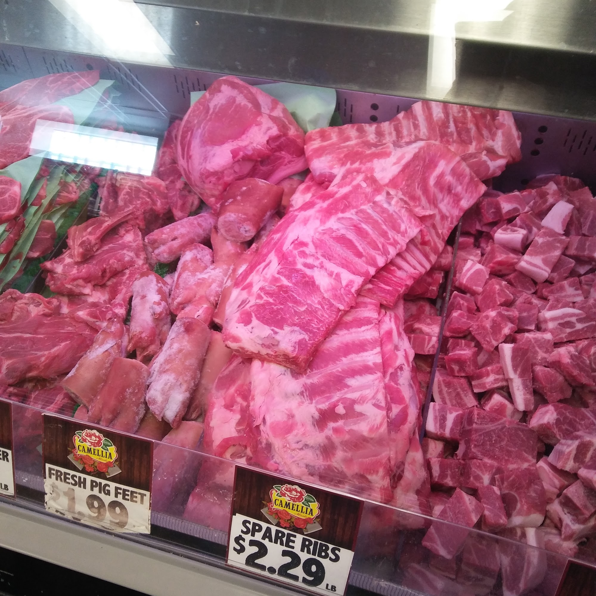 Camellia Meats is a one stop shop offering fresh cut meats, deli, seafood, groceries, and produce. It has a huge selection of meats, including steaks, ox tails, sausages, and wings, all at great and fair prices. The staff is very friendly, helpful, and knowledgeable. The store is clean with a convenient frozen section, though some produce can be a little wilted. At times, the store could use more employees for the customer demand. Overall, it provides high quality, fresh, and delicious products.