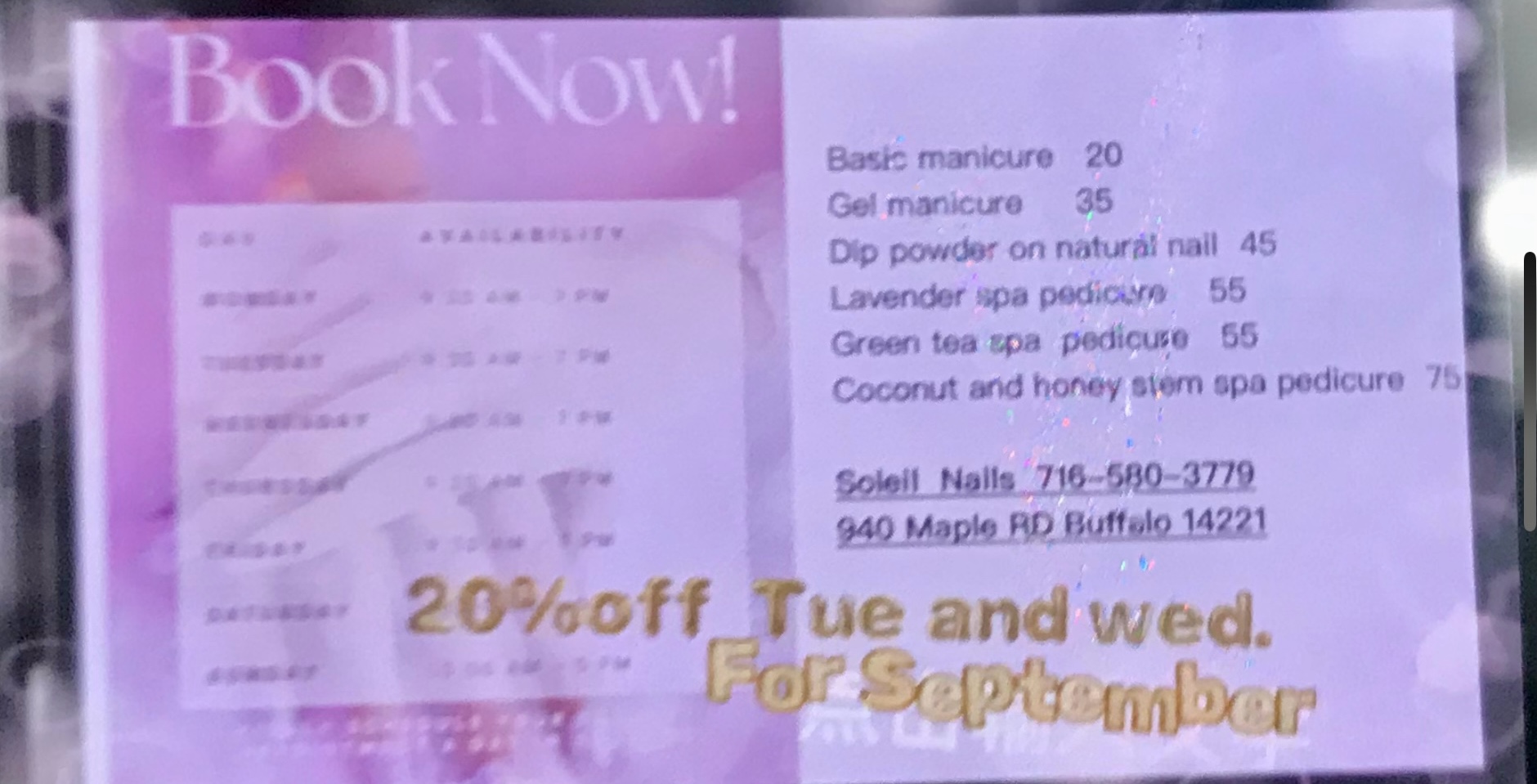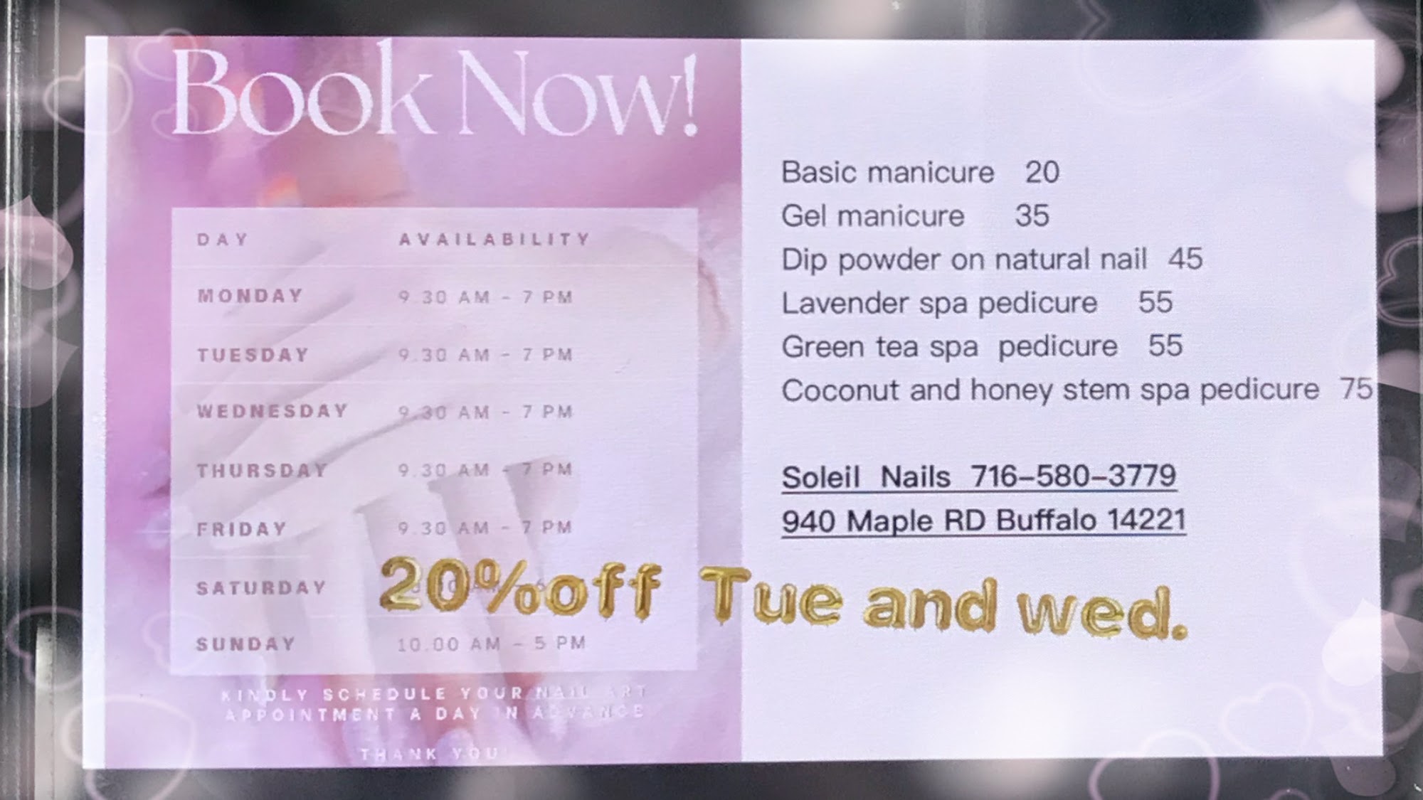 Soleil Nails in Williamsville is a popular salon known for its high-quality nail care and friendly service. The experienced technicians offer a variety of services, including manicures, pedicures, and creative nail art, ensuring each client leaves with beautiful, flawless nails. The salon provides a relaxing, clean environment where staff pays close attention to details and customer needs. They are friendly, helpful, and great with families and kids, making every visit comfortable and enjoyable. Many customers praise the skill and professionalism of the team, highlighting their ability to create and maintain healthy, stunning nails. Overall, Soleil Nails is a trusted spot for anyone seeking a relaxing, top-notch nail experience.
