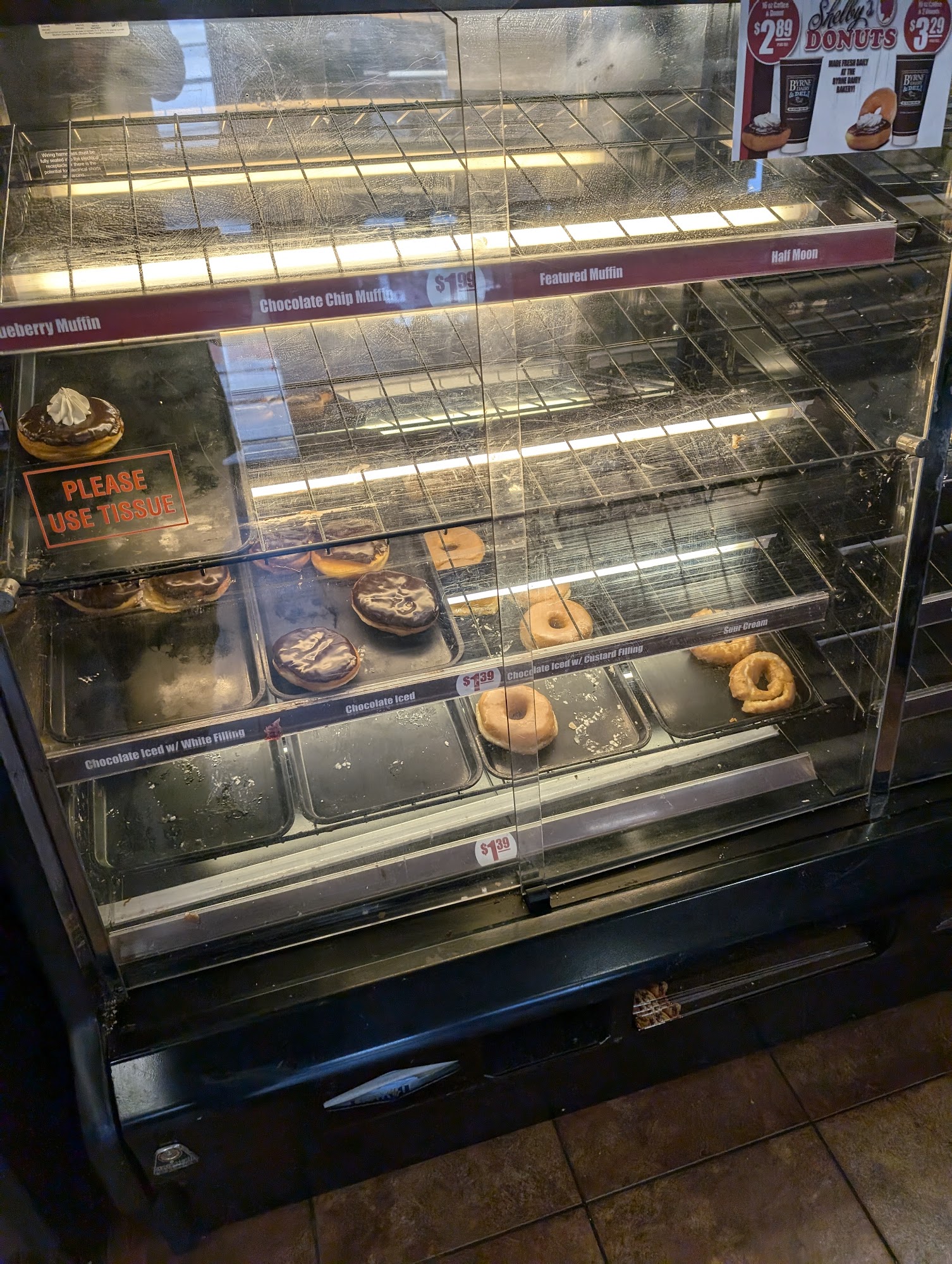 The donuts display is filthy. Looks like it hasn't been cleaned in months. Overall it seems like the could use a good cleaning