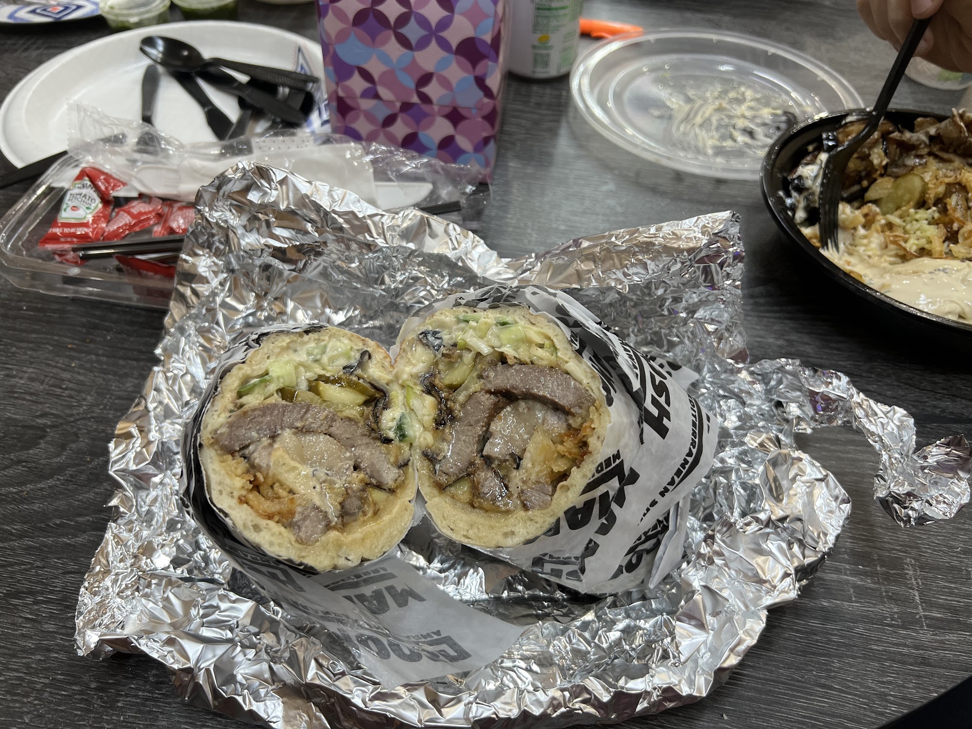 Mamoosh is a restaurant serving fresh, hot and absolutely delicious food. It is known for its chicken shawarma in a soft pita, where you can pick different toppings and spreads, and its delicious falafel. The burgers are also absolutely delicious and considered among the best. The homemade soups are fantastic. The restaurant features a fixins bar with items like cabbage, sauces, pickles, and onions. Portions, like the shawarma and a large size of really good fries, are big. However, many find it a little pricey or expensive, with add-ons costing extra. The service is exceptional and the menu offers exquisite flavors, providing elevated dining. It is a must-visit for food enthusiasts.