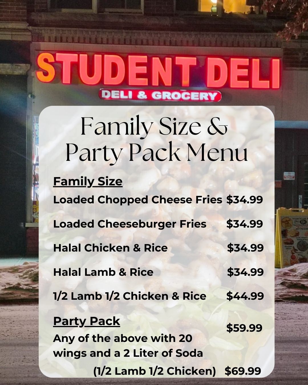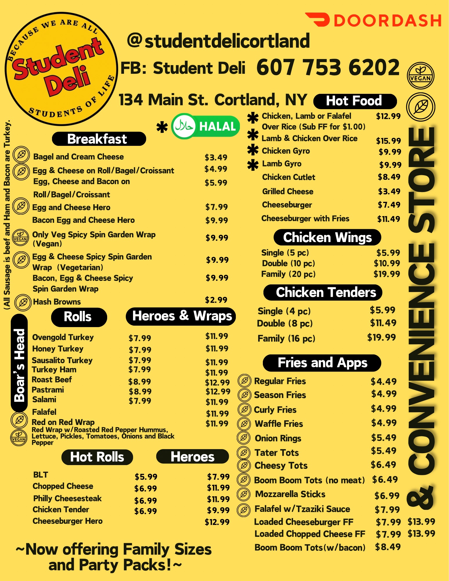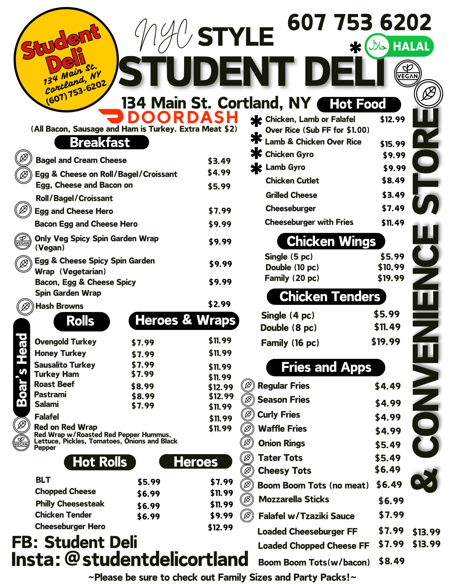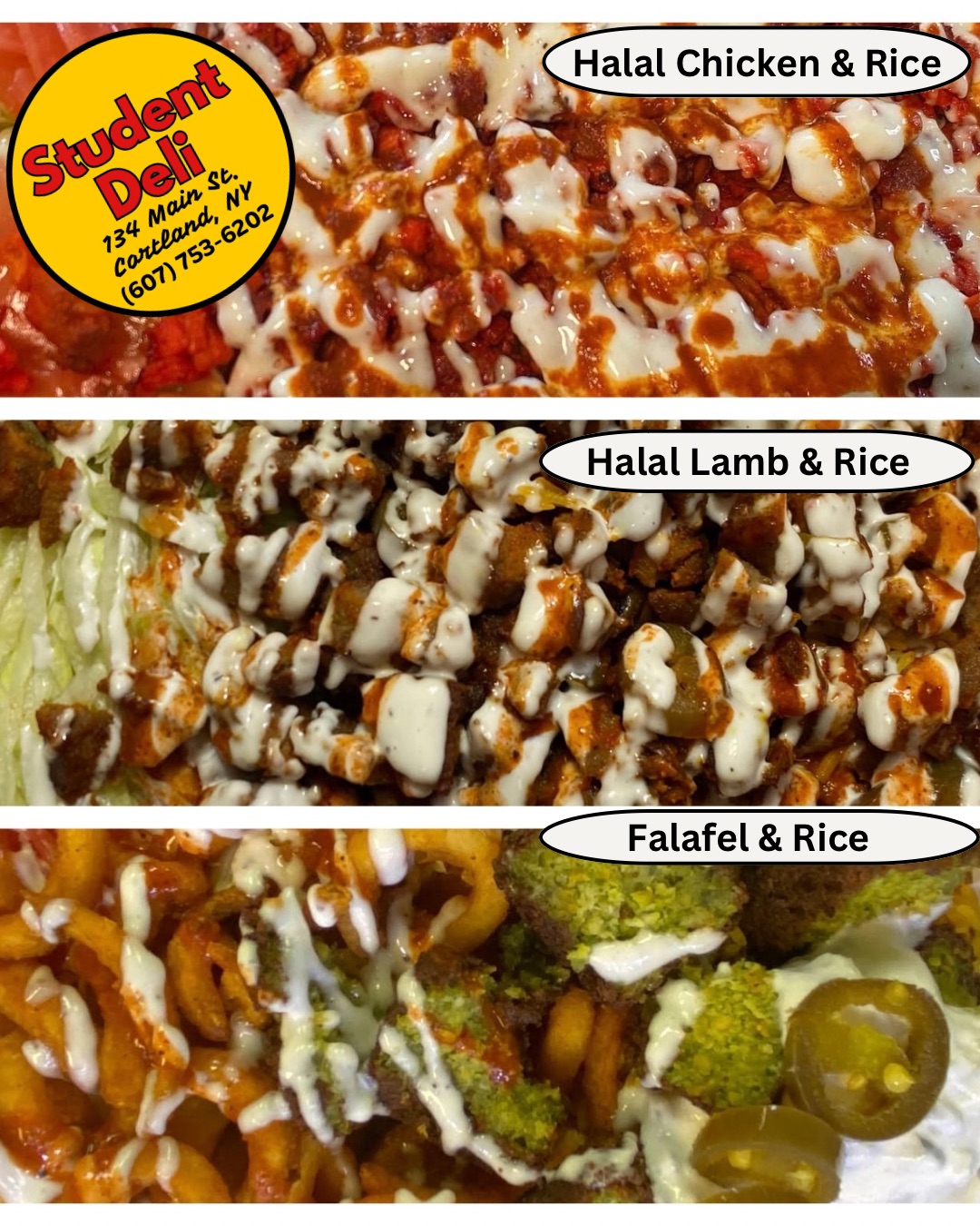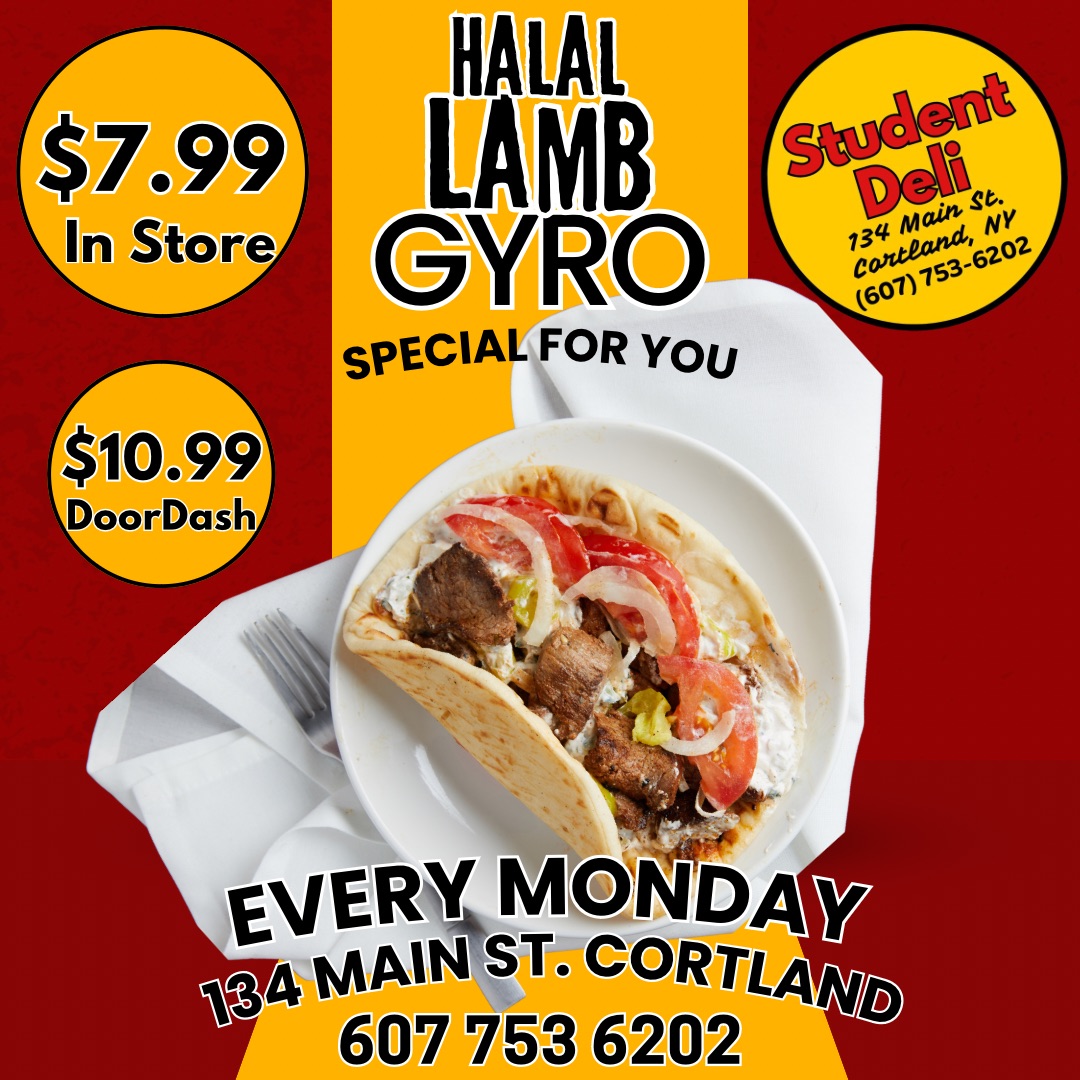 Family-owned New York City style deli right here in the heart of historic downtown Cortland. Missing the city and its cuisine? Say no more. Serving up breakfast, lunch and dinner. Complete with Boar's Head meats and cheeses, halal food including lamb and chicken each served with rice or as a gyro. For vegetarians there are a wide range of options including falafel, hummus, and Tzaziki sauce. Rolls, heroes and wraps are always available. Check out the authentic NYC style chopped cheese, Philly cheese steak, high-grade burger, $10 lunch specials every day between 11-3 every day and daily specials Mon-Thursday. Convenience, grocery and small gift shop (Déjà Vu Outpost) to top off your experience. Looking forward to seeing you!