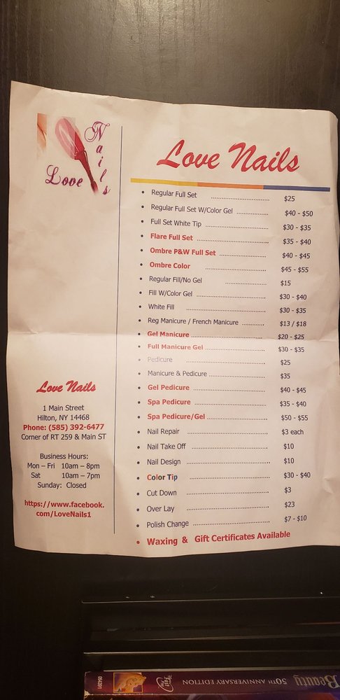 Love Nails is a great little shop in a small town. The technicians are very nice, sweet, and friendly, with a great attention to detail. They do lovely and amazing work, and are known to work very fast. The spa is clean. Services include gel manicures, pedicures, acrylic nails, and eyebrow waxing. Most reviewers are very happy and plan to return. However, one customer felt overcharged for a full set of services, noting that prices are not posted and can be high.