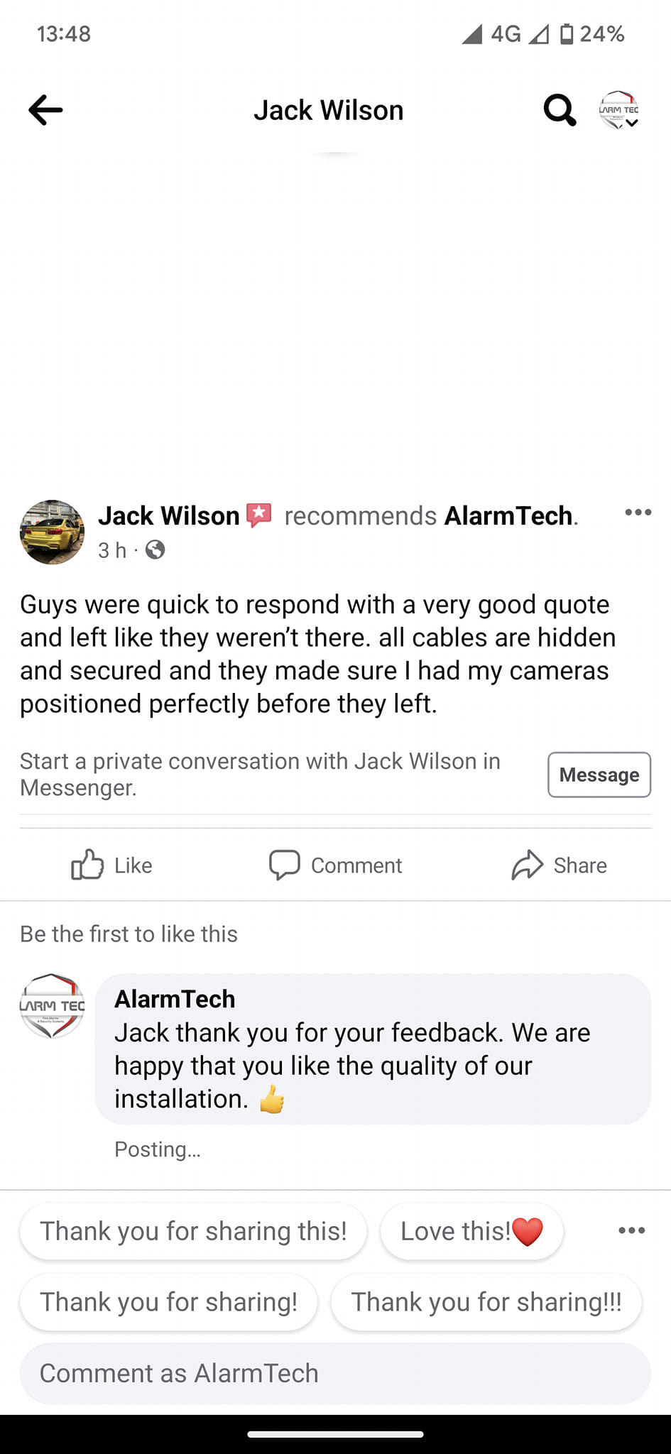 Great service and tidy work from the guys at Alarmtech, would highly recommend and use again.