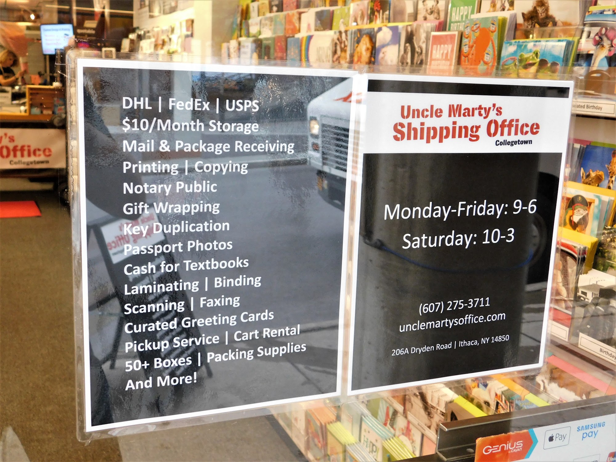 Uncle Marty’s is Collegetown’s favorite place for packing, shipping, printing, storage, mailbox rental, and more! We strive to make things simple, saving you time and sharing a smile as we meet—and exceed—your business center needs at our one-stop shop.
