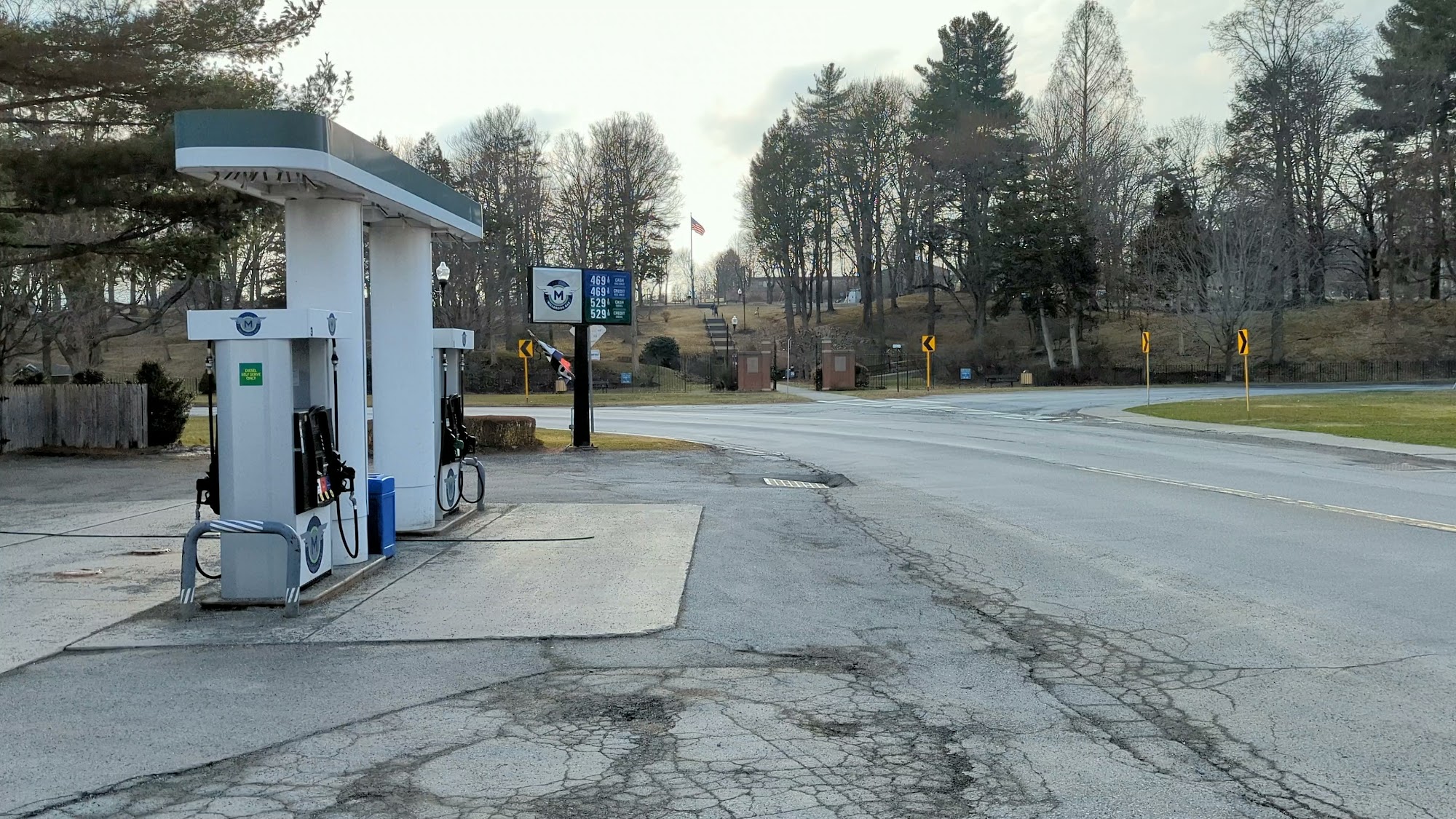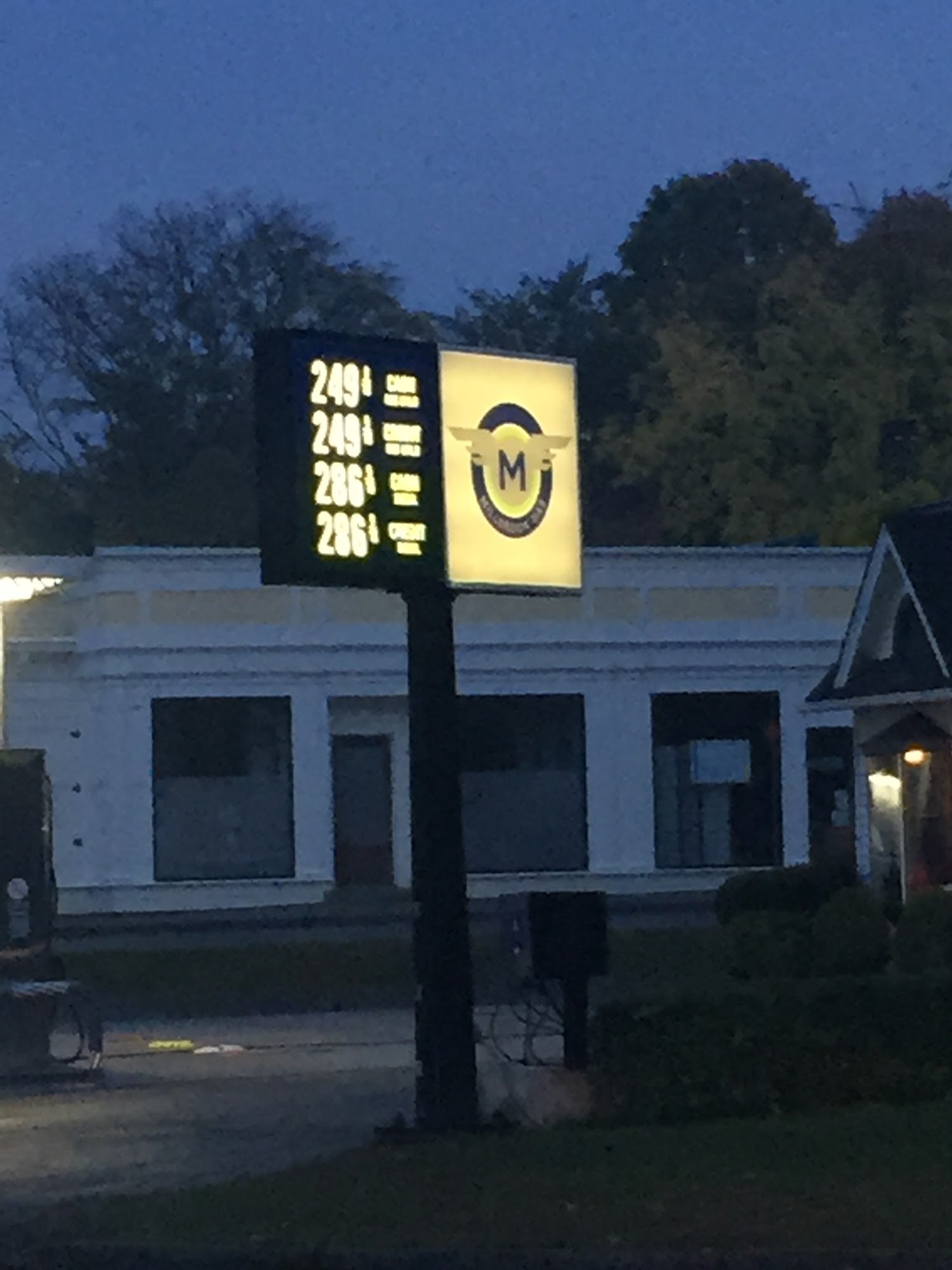 Points for being a full-service station when those are few and far between. Otherwise a simple station with just two pumps. Polite masked attendant, and there is a hose for filling tires with compressed air. Decent illumination, and located right next to Triumph Gardens.