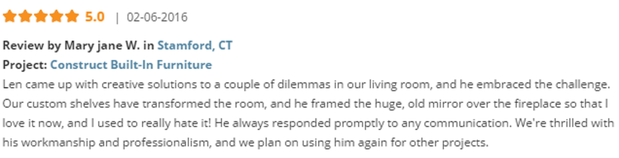 I am beyond impressed with Len and Old Bedford Fine Custom. I am hard to please and the final product is just beautiful! He did a 13 foot built-in entertainment unit for me and I will have him back to do a bar to match. I highly recommend Old Bedford
