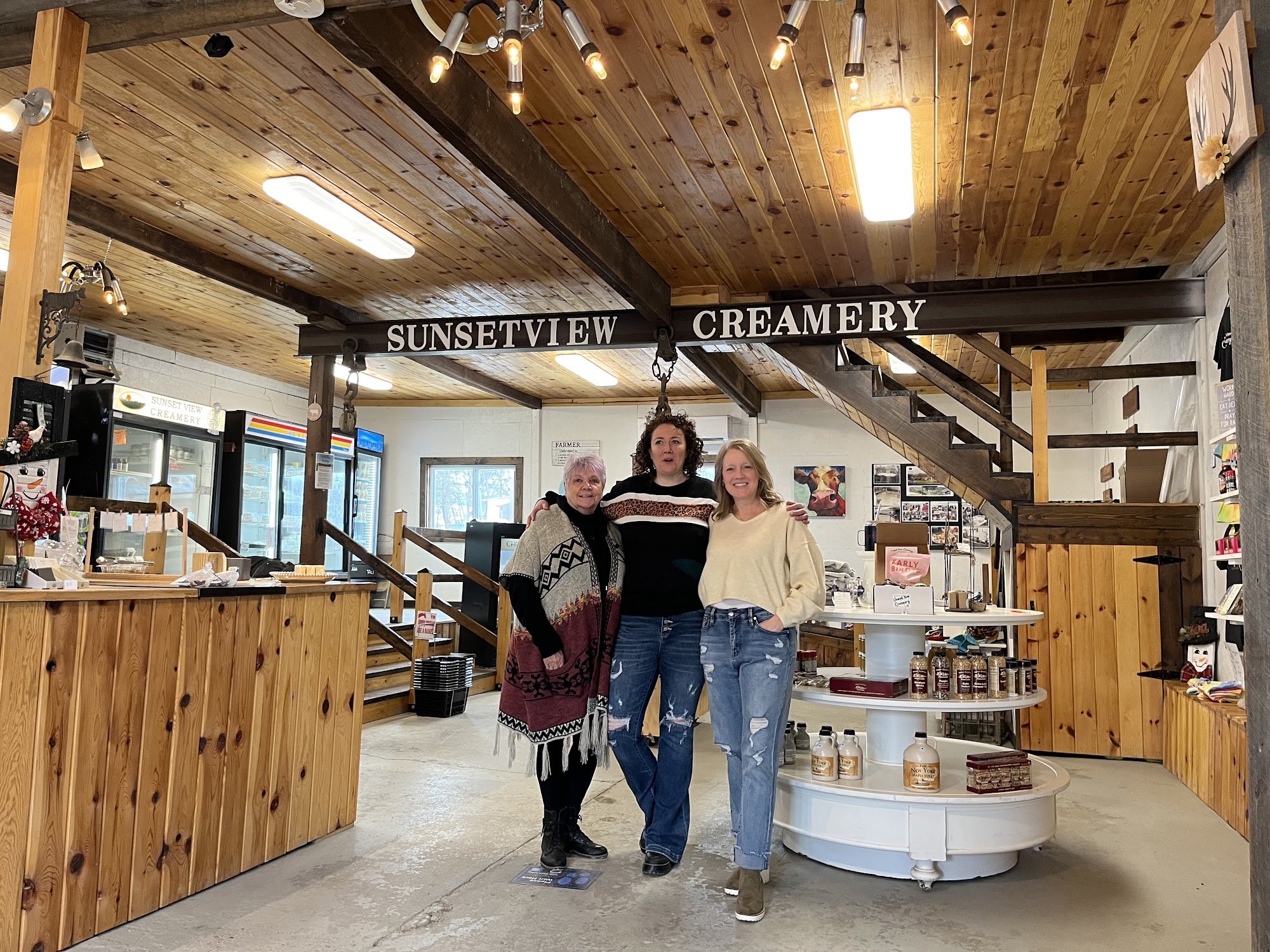 Sunset View Creamery is a fifth-generation dairy farm offering a charming and welcoming experience. Visitors describe it as a wonderful, cute little spot with a beautiful location. The farm is known for its friendly and accommodating staff, who provide helpful service. A major highlight is the unique cow cuddling experience, which is fun for both children and adults, often including opportunities to see calves. The farm retail shop features a variety of tasty, hand-made artisanal raw milk cow cheeses, delicious raw milk, cheese curds, and other milk products like exceptional chocolate milk. It also carries other locally sourced goods such as sauces, peanut butter blends, jams, and sweaters or shirts. Many visitors enjoy the free self-guided tours. The atmosphere is enhanced by very friendly farm dogs that greet guests and play fetch. The business offers decent prices and nationwide shipping. It is a highly recommended stop, with many guests eager to return.