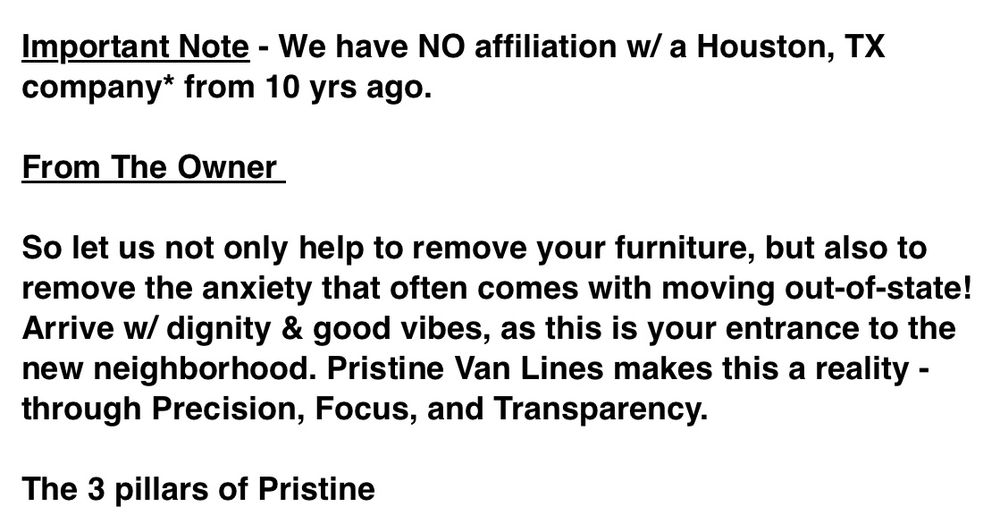 PRISTINE VAN LINES is a licensed and insured long-distance moving company known for its excellent service and professionalism. The team, with a combined experience of 50 years in the moving and logistics industry, offers a range of services including packing, loading, transporting, and unpacking. Customers have consistently praised the crew for being fast, helpful, and friendly, even in challenging weather conditions. Reviews highlight the company's ability to manage last-minute changes and additional items with ease. The staff is noted for their attention to detail, ensuring that all belongings are handled with care and arrive without damage. PRISTINE VAN LINES also provides reasonable pricing, and many customers recommend the company for its excellent accommodation and reliability. The storage facilities are secure, climate-controlled, and well-organized, providing additional peace of mind. Overall, PRISTINE VAN LINES is highly recommended by customers for a fantastic moving experience.