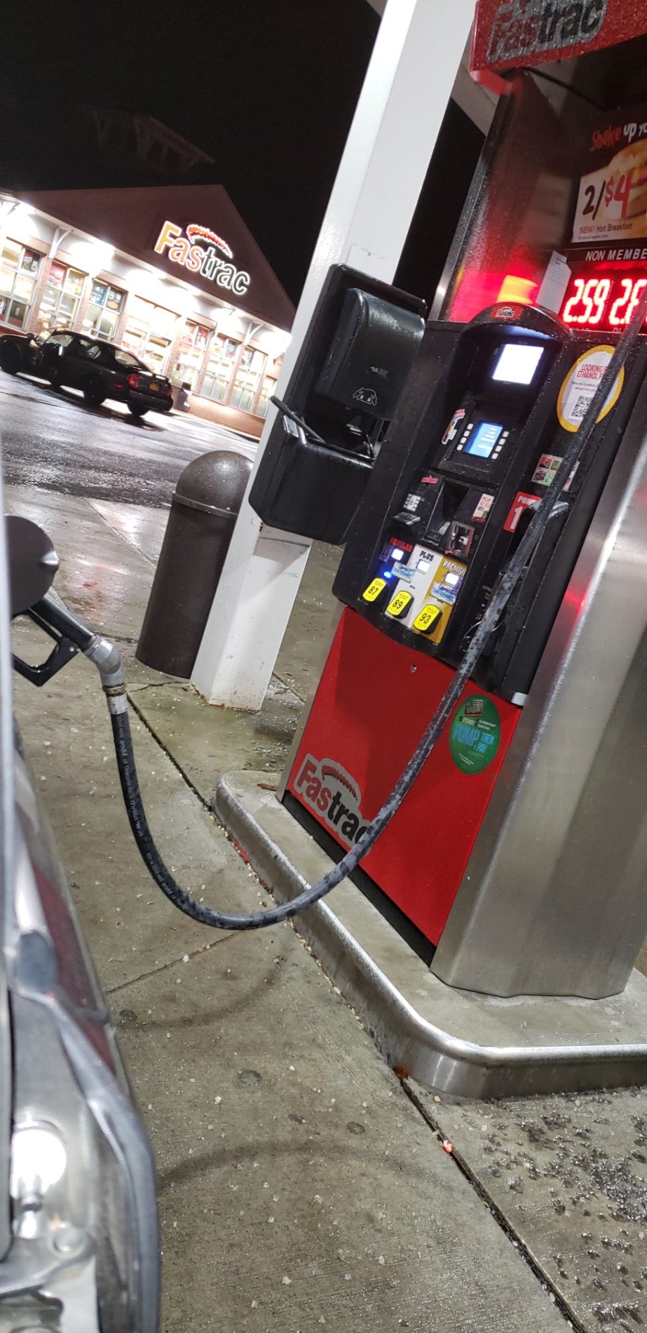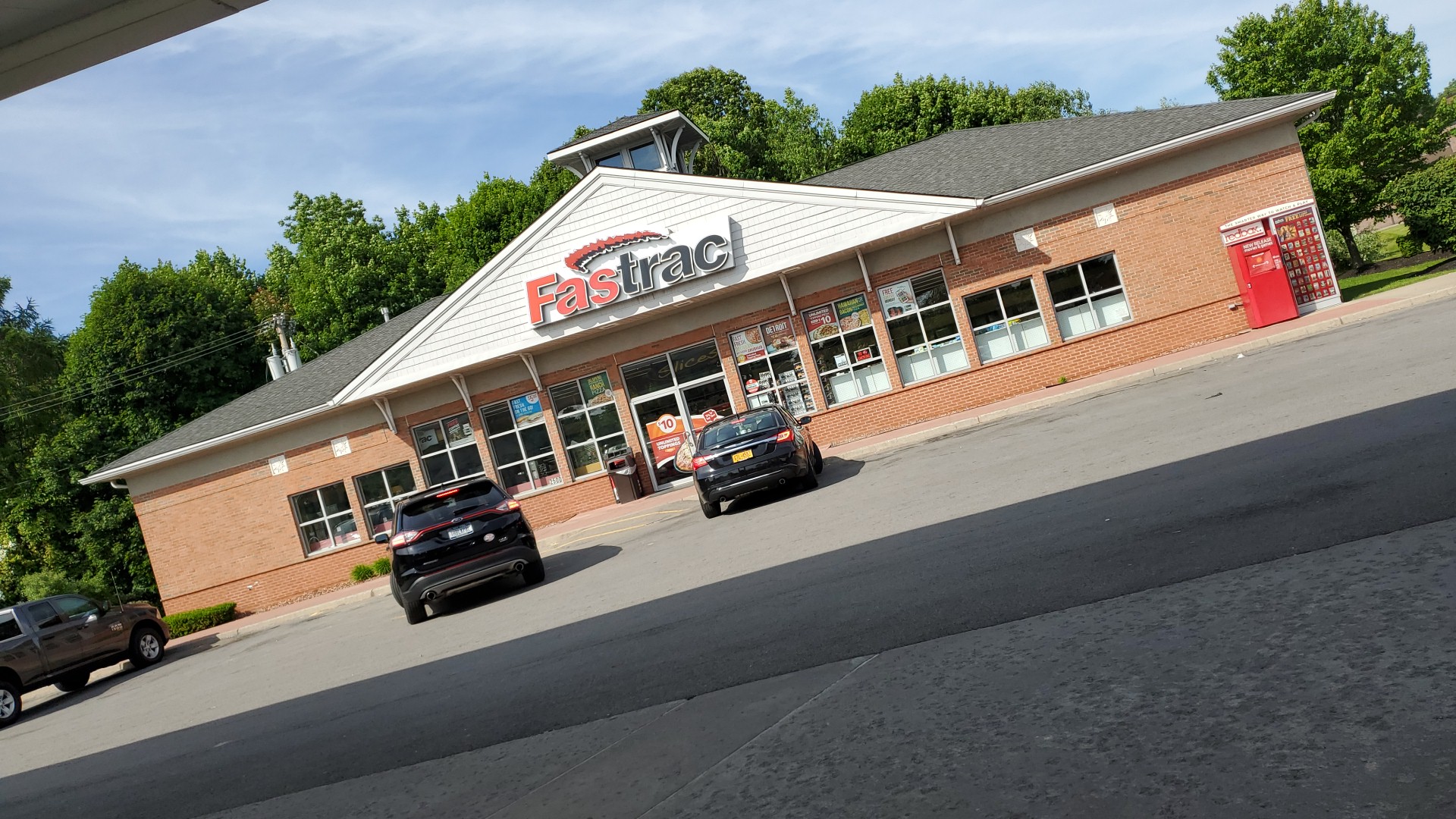 Fastrac is a gas station chain noted for its good prices on gas and reasonably fast, professionally friendly service. It enables customers to get gas quickly and cleanly, with pumps that are reliably tidy. The location also offers a variety of hot food, including several varieties of pizza, which is cheaper when bought as a whole pie. They have a soda fountain and snacks like brownies. However, some hot food items, like the cheese pizza, have been criticized for being extremely salty, and the tire air pump is unreliable. The fuel pumps have also had issues, not printing receipts for an extended period.
