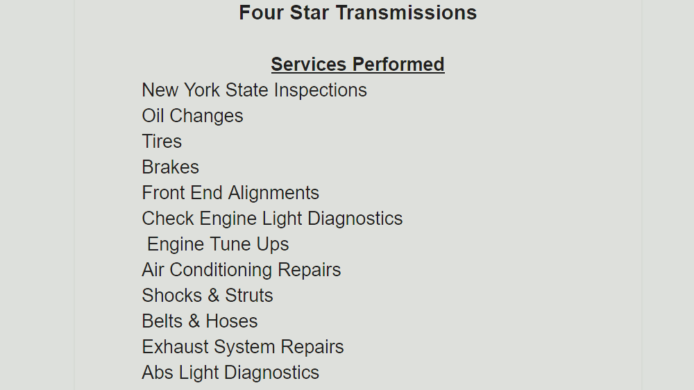 At Four Star Transmissions, Inc., customers can expect a convenient and reliable experience for their vehicle's transmission repair needs. The family-owned business has been operating for over 40 years, offering services such as free check-ups, inspections, and same-day service, as well as oil changes and lube service. They honor most extended warranties and are known for their honest and professional approach, with customers praising the excellent mechanics and the integrity of the staff. Whether it's a transmission issue or a routine maintenance, Four Star Transmissions is committed to providing high-quality service and ensuring the longevity of their clients' vehicles.