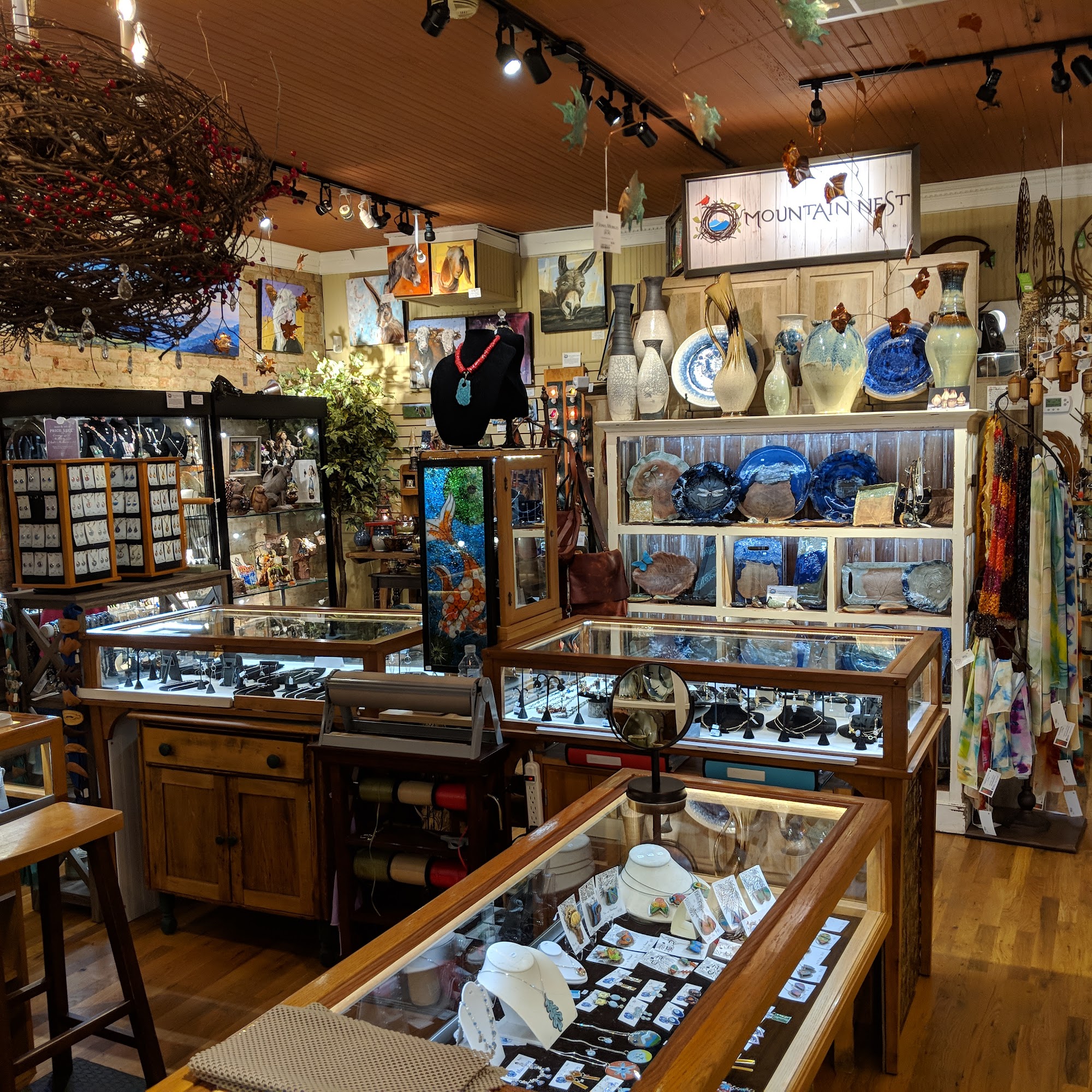Mountain Nest is a charming art gallery located in the heart of Black Mountain, North Carolina, featuring the work of over 100 local and regional artists. The gallery offers a diverse collection of art, including prints, giclees, and original paintings, as well as exquisite pottery, jewelry, and a variety of handcrafted items in metal, stone, wood, and leather. Visitors to Mountain Nest can expect a friendly and welcoming atmosphere, with knowledgeable staff who are happy to assist and answer any questions. The gallery's selection is described as "phenomenal," with everything from beautifully painted guitars to detailed and unique leather purses. Customers have consistently praised the quality and variety of the artwork, with many highlighting the vibrant colors and attention to detail in the pieces. The prices are also noted to be reasonable, making it easy for visitors to find something special to take home. Whether you're a local or just passing through, a visit to Mountain Nest is highly recommended. The gallery is a showcase for the talented artists of the Black Mountain region, and a delightful place to explore and discover new works of art.