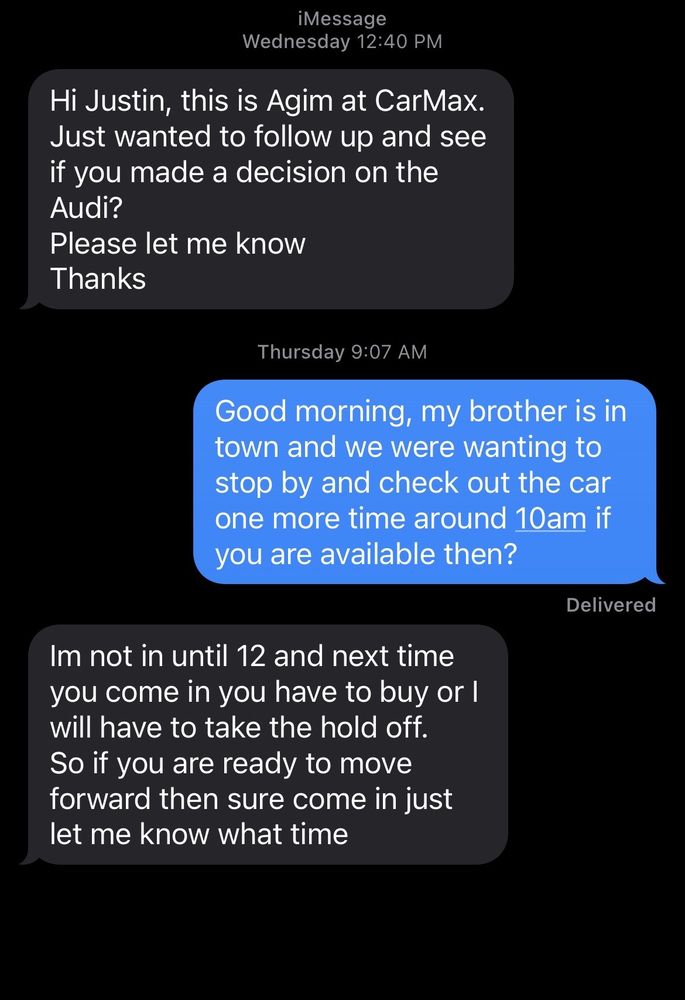 The sales person was good. Only bad thing is l wish they would check their cars thoroughly. I needed a distributor cap and spark plugs after my purchase. Thank God for the 3 month warranty they give you at Carmax. Other than that it was good.