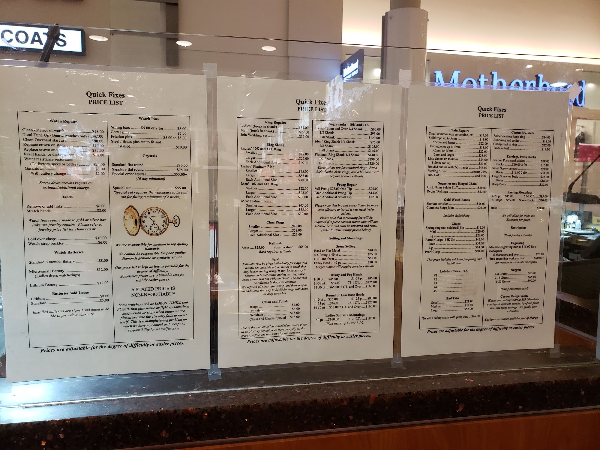 We always go to these guys. They are awesome! Several visits with jewelry for repairs, resizing, cleaning, and always top notch workmanship with friendly customer service! We will continue to use Quick Fixes at Concord Mills mall.