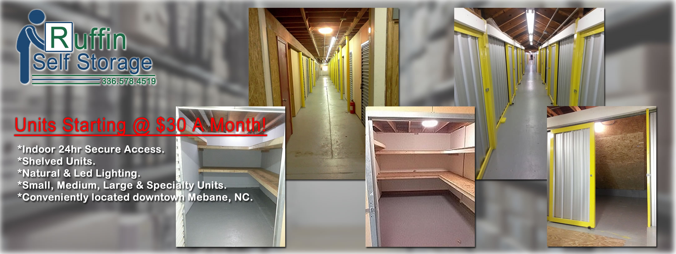 Indoor Self Storage NC historical building that has been upgraded and refurbished by the owner and operated since 2009. Terry Gould upgraded the building with state of art features like shelving, LED lighting, 24hr access entry, indoor bathrooms and several units have neatural lighting. We are conveniently located downtown Mebane, NC one block from all the resturants and shops. We provide a friendly and professional atmosphere. Newcomers can talk with Terry (owner) on what and where to go and get established in North Carolina. You wont find a better storage facility in North Carolina for prices and quality then Ruffin Self Storage of Mebane NC.