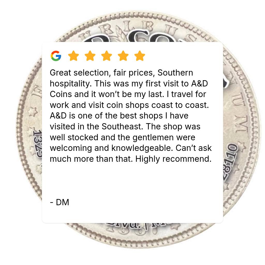 A & D Coins is a well-regarded coin shop known for its great selection and fair prices, making it a top destination in the Southeast. Customers appreciate the welcoming atmosphere and the knowledgeable staff, who are kind, patient, and willing to explain and teach about numismatics. The owner is friendly and offers honest advice regarding various purchasing options, ensuring satisfaction with every transaction. Many reviews highlight the shop's expertise in buying and selling gold and silver bullion and coins. Newcomers to coin collecting feel trusted and well-informed after visiting. Overall, A & D Coins comes highly recommended for anyone interested in coins or bullion.
