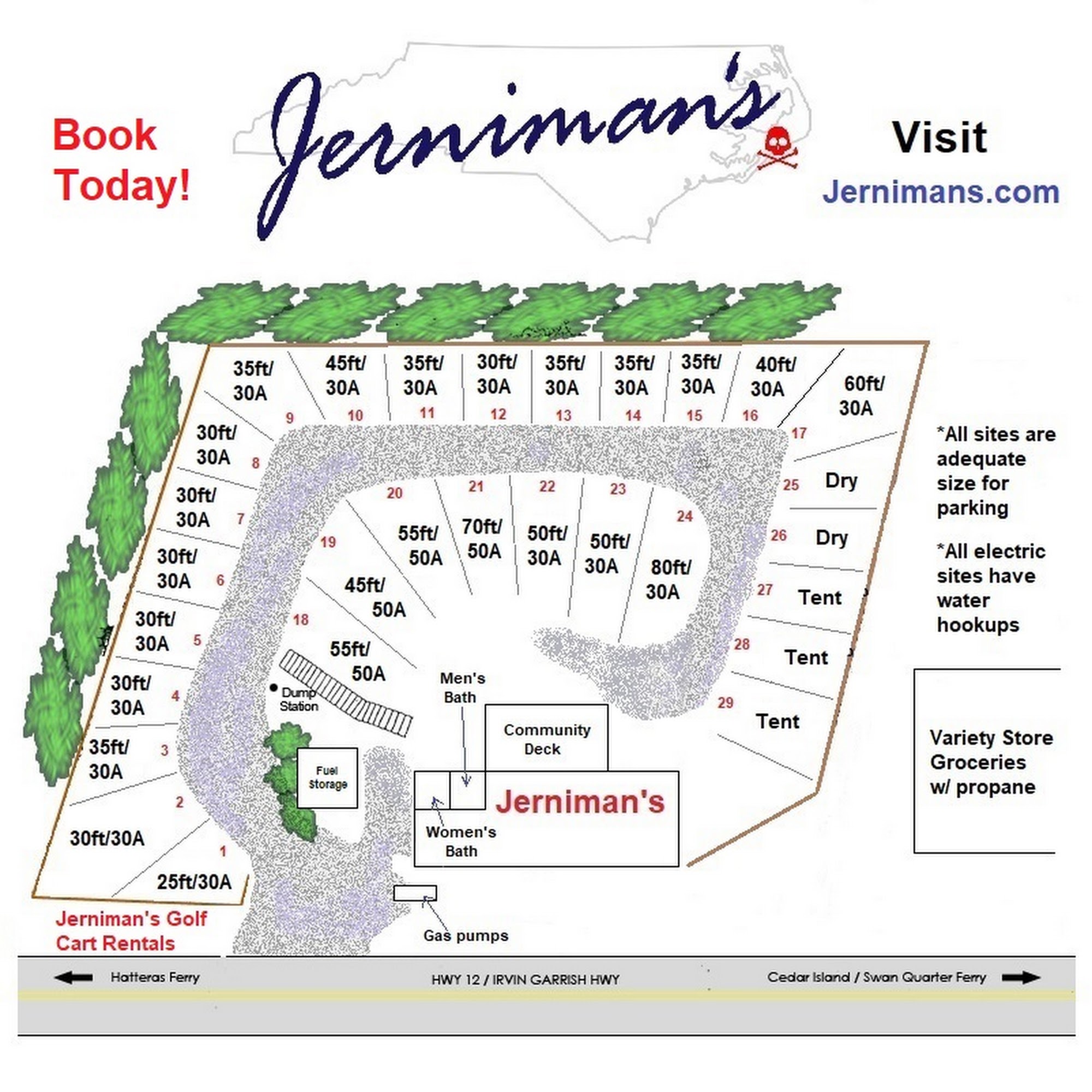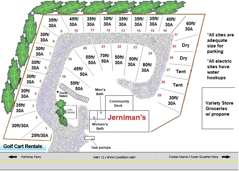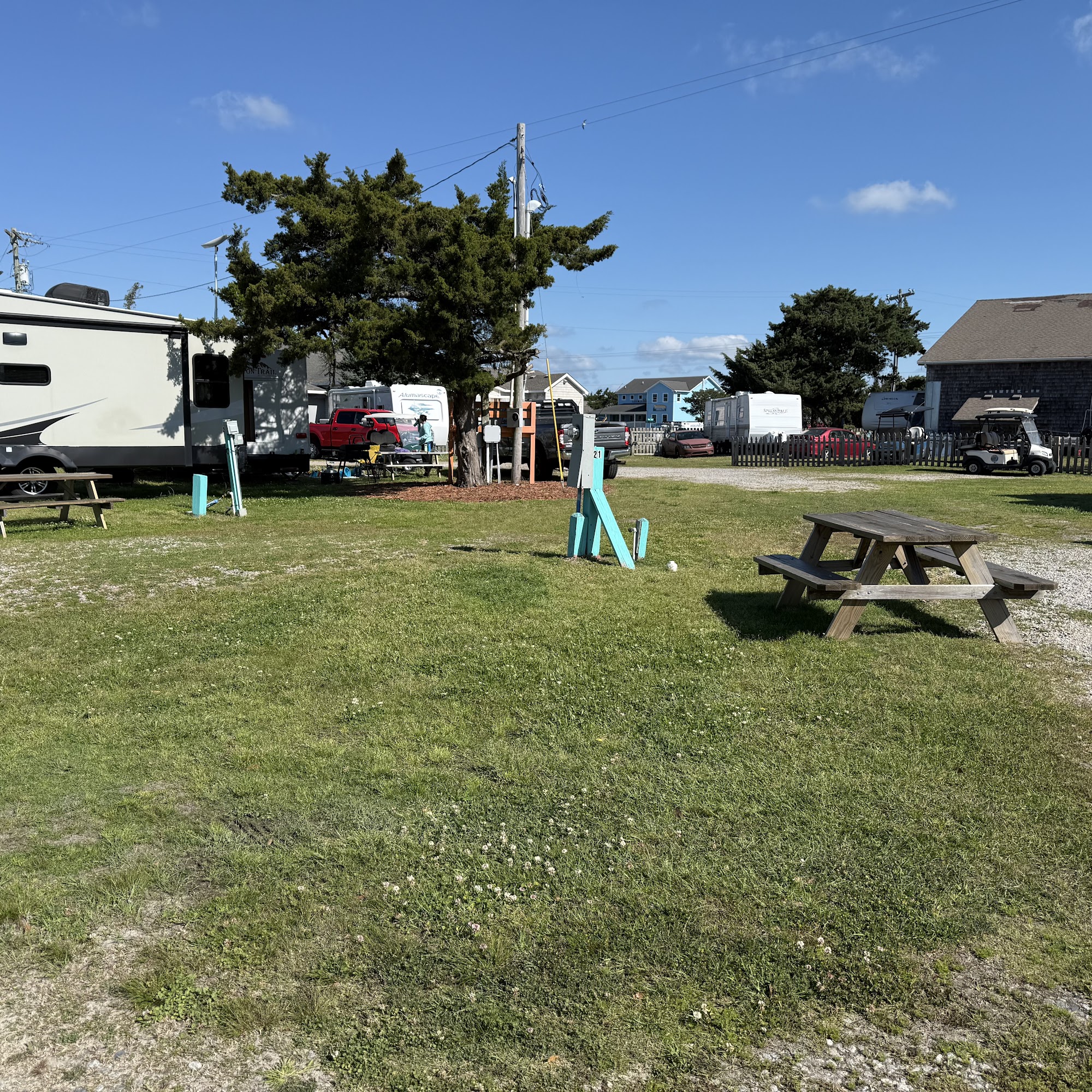 Jerniman's Campground is a family-friendly island campground located on Ocracoke Island, offering a unique and enjoyable getaway experience. The campground features spacious camper, RV, and tent lots, all with convenient hookups for water, septic, and electricity. Visitors can rent golf carts to explore the area easily and enjoy amenities like picnic tables and a full, private bathhouse with four units. The location is excellent, close to the village's restaurants, shops, and attractions, making it easy for guests to dine out and explore. Access is via a ferry from Cedar Island, and although the entrance sign can be hard to see from the highway, the campground accommodates large vehicles comfortably, with sites large enough for 40- and 45-foot rigs. Guests praise the water quality, strong Verizon signal, and friendly staff, who go above and beyond to help, such as offering free stays or extra amenities in case of issues. The campground is also near the best local restaurants, museums, and points of interest, like the Ocracoke Lighthouse and the British Cemetery. Despite challenges like flooding and storm damage, visitors appreciate the friendly atmosphere, clean facilities, and stunning sunsets, making Jerniman's a top choice for a relaxing island retreat.