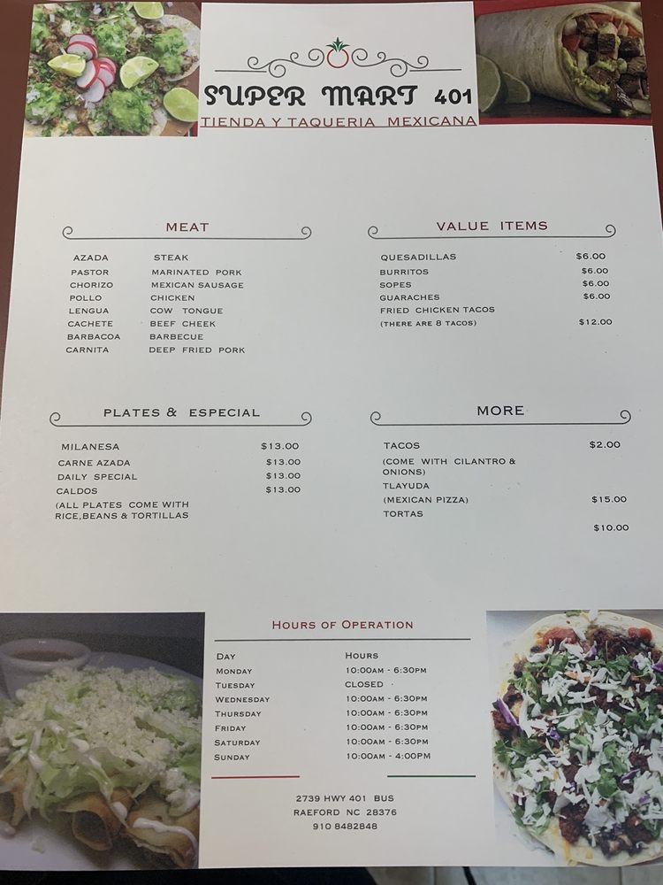 Super Mart is a popular spot in Raeford known for its authentic Mexican tacos and excellent hospitality. Customers appreciate the amazing food and the unique ingredients available for cooking. While the limited seating can lead to waits during lunch hours, many visitors are willing to endure this for the delicious meals. Loyal customers often return, even after moving away, making it a must-stop on trips back to the area. The menu includes flavorful lengua tacos served with cilantro and onions, paired with tasty salsa. With a variety of chilled beverages and great value, Super Mart is highly recommended for anyone craving authentic Mexican cuisine.