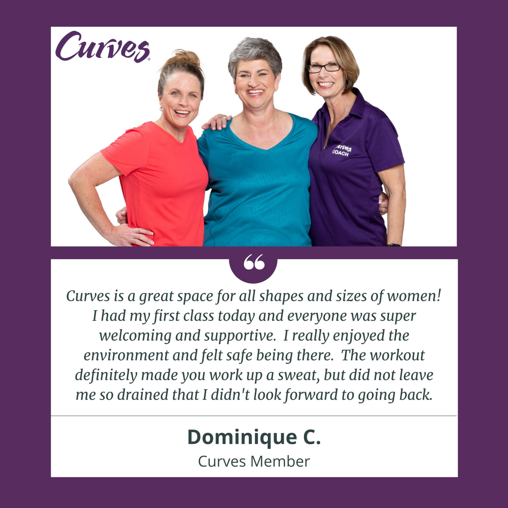 I started going to Curves while visiting family during the holiday and I can say that I am in the right place. The morning trainer makes me comfortable by explaining every step. I’ve really enjoyed the coaching and community.