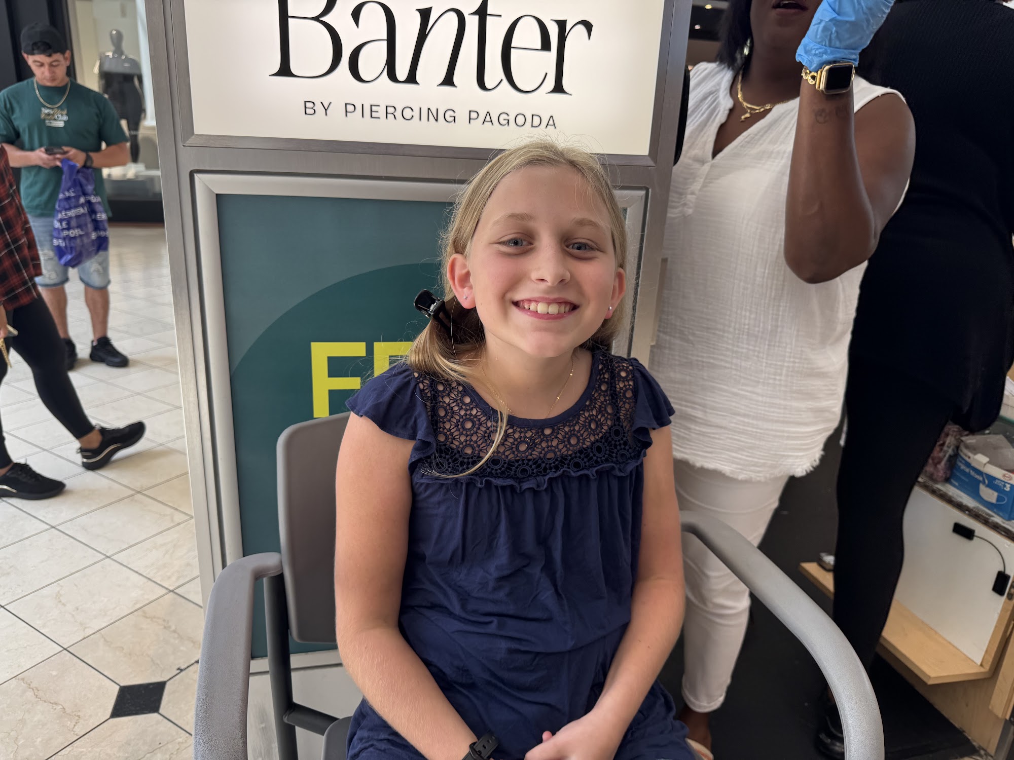 Banter by Piercing Pagoda offers free ear piercings with the purchase of piercing jewelry every day, making it a popular choice for those looking to enhance their style. The kiosk welcomes walk-ins and appointments, showcasing over 60 years of expertise in ear piercing. Customers have praised the skilled Piercing Pros, particularly highlighting their patience and professionalism. Reviews mention positive experiences with piercings for both adults and children, with special commendation for staff members like Naiya and Christina, who provide gentle and reassuring guidance during the process. Many clients appreciate the calm atmosphere and the individualized attention they receive, especially when bringing in young children. The service is described as smooth and pleasant, with staff going above and beyond to ensure comfort and satisfaction. In addition, the management team is noted for their responsiveness and excellent customer service, which leaves a lasting impression on visitors. Overall, Banter by Piercing Pagoda is recognized for its friendly environment and exceptional ear piercing services.