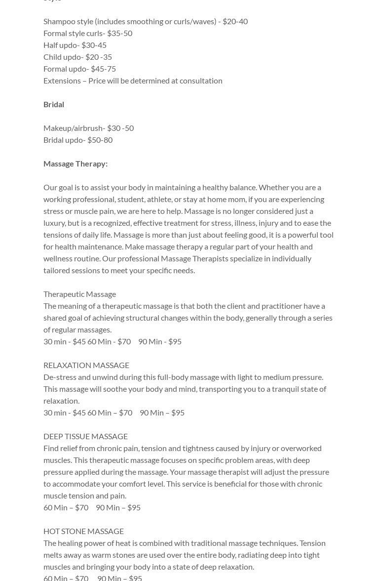 I have not gotten my hair nails done here yet but I have come here for a massage a few times. I really enjoy the masseuse. I think she does a great job, if you're looking for a masseuse I would definitely recommend you stop by.